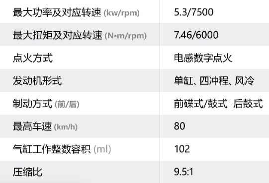全新喜蘊100采用本田經(jīng)典SCR100發(fā)動機,配合最新高效電噴技術,實現(xiàn)5.3kw/7500rpm最大功率,以及7.46N·m/6000rpm最大扭矩,最大爬坡角度達到≥20°,發(fā)動機可享受3年或3萬公里質(zhì)保。