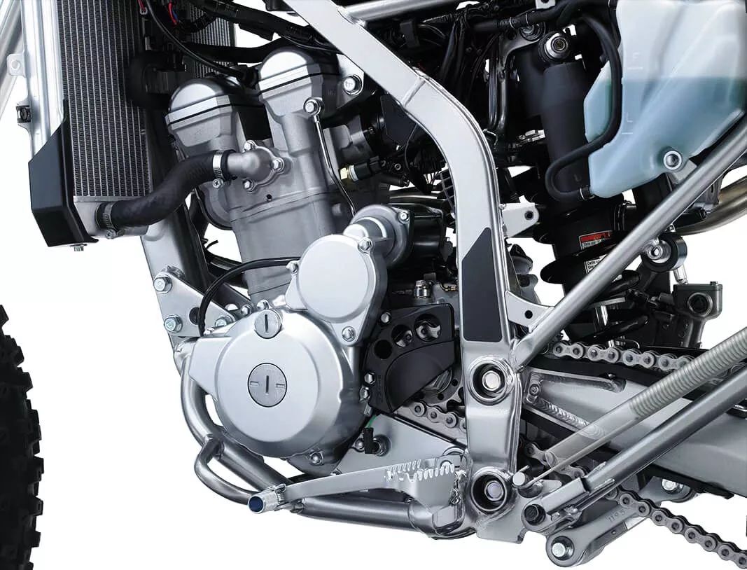 對(duì)于歐美市場(chǎng)來說,新的 KLX300R 定位于 KLX 系列(KLX110、KLX140)的入門級(jí)越野訓(xùn)練用車到 KX 系列(KX250、KX450)市售越野賽車之間的過渡。該車搭載一副水冷四沖程單汽缸、DOHC 四汽閥的發(fā)動(dòng)機(jī),缸徑、行程為 78 mm x 61.2 mm,排汽量 292 cc,六檔的變速齒輪箱,采用一具節(jié)汽閥口徑為 34 mm 的 Keihin 京濱化油器負(fù)責(zé)油/汽混合和供油。