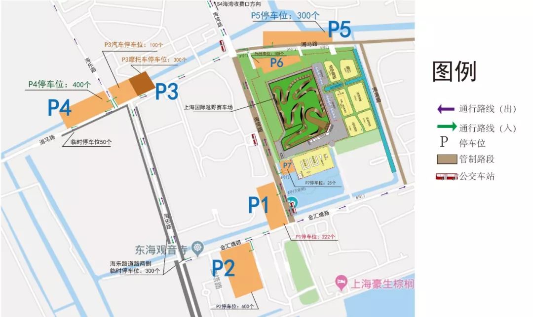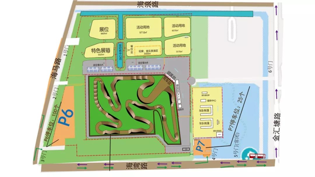 這里在提醒一句,目前所有導航上的“上海國際越野賽車場”都是在P7的位置,實際觀眾檢票入口在海馬路1號門,VIP觀眾入口在金匯塘路6號門,請各位合理安排導航!