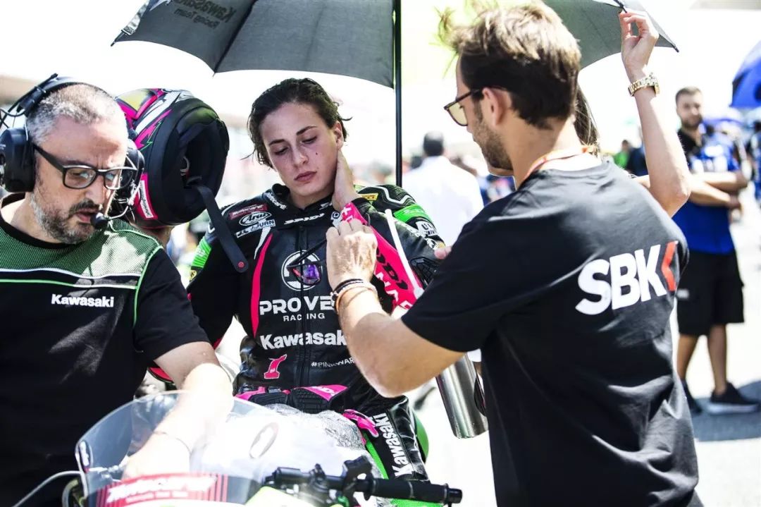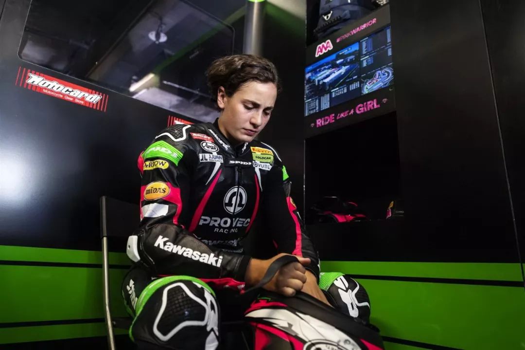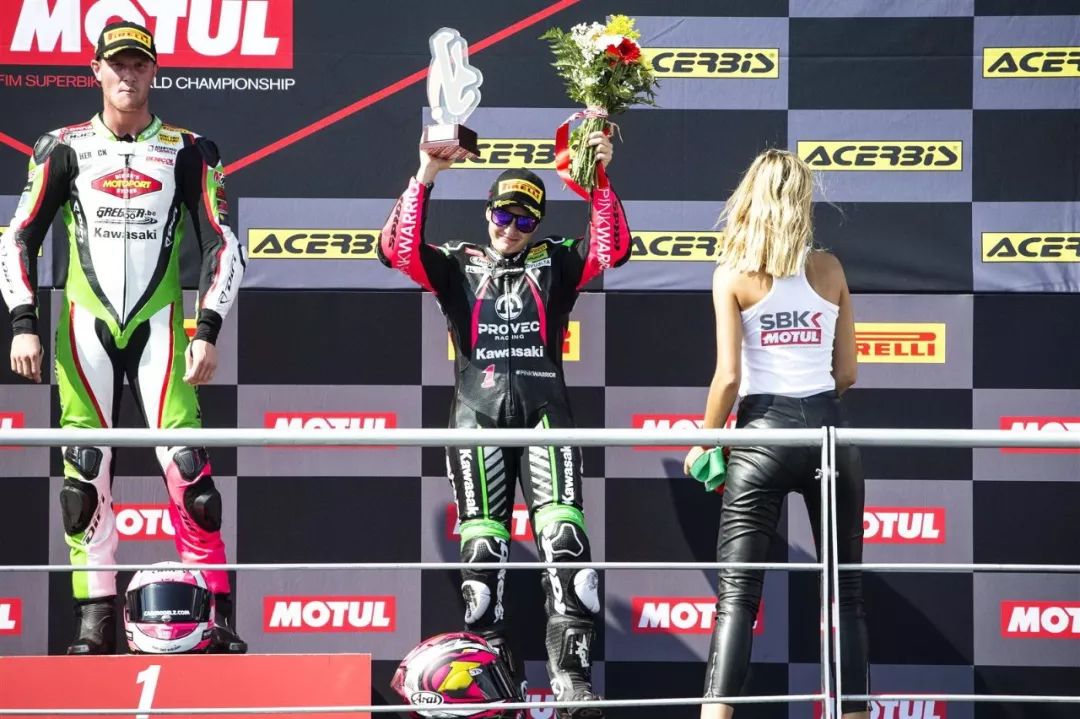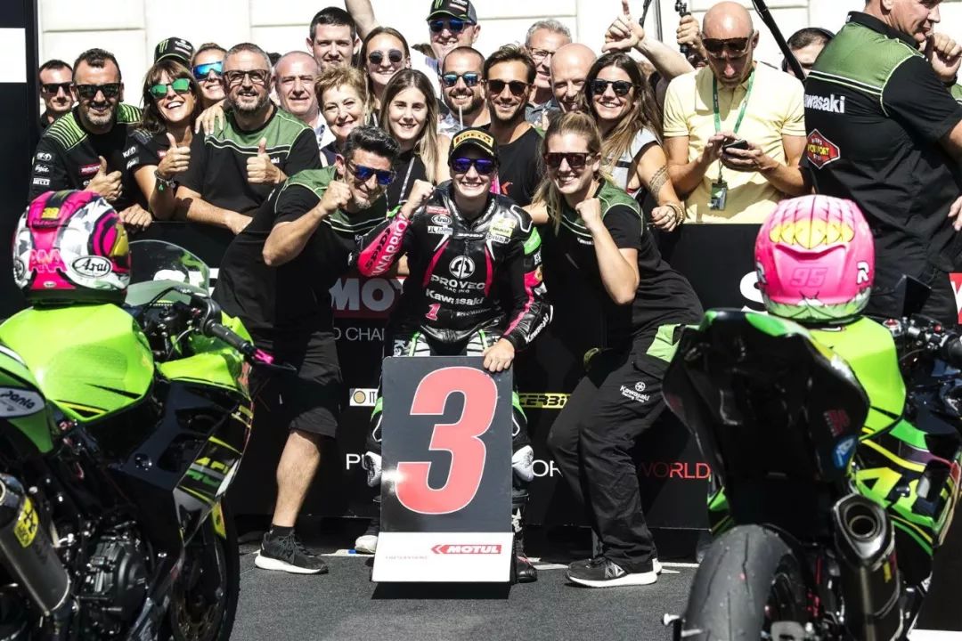 WSSP 300 級(jí)別,經(jīng)過(guò)了 11 圈、共約 50.512 公里的較量,駕駛 1 號(hào)車(chē)出戰(zhàn)的應(yīng)屆世界冠軍、來(lái)自西班牙的女車(chē)手卡拉斯科(Ana Carrasco)最終奪得了頒獎(jiǎng)臺(tái)上的最后一個(gè)位置,拿下了第三名。她比后面取得第四名的車(chē)手,領(lǐng)先了僅僅是 0.047 秒。