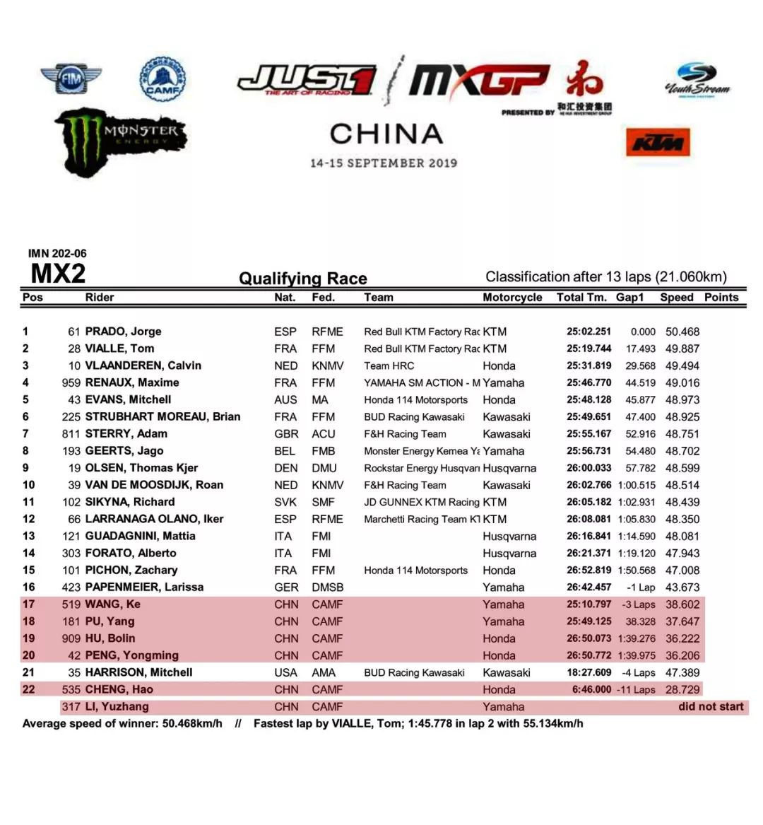 有十位中國(guó)車(chē)手(MXGP 級(jí)別三位、MX2 級(jí)別七位)以外卡身份、報(bào)名參加本站的比賽。在今天舉行的預(yù)選賽,有九位中國(guó)車(chē)手出賽(MXGP級(jí)別三位、MX2 級(jí)別六位)。