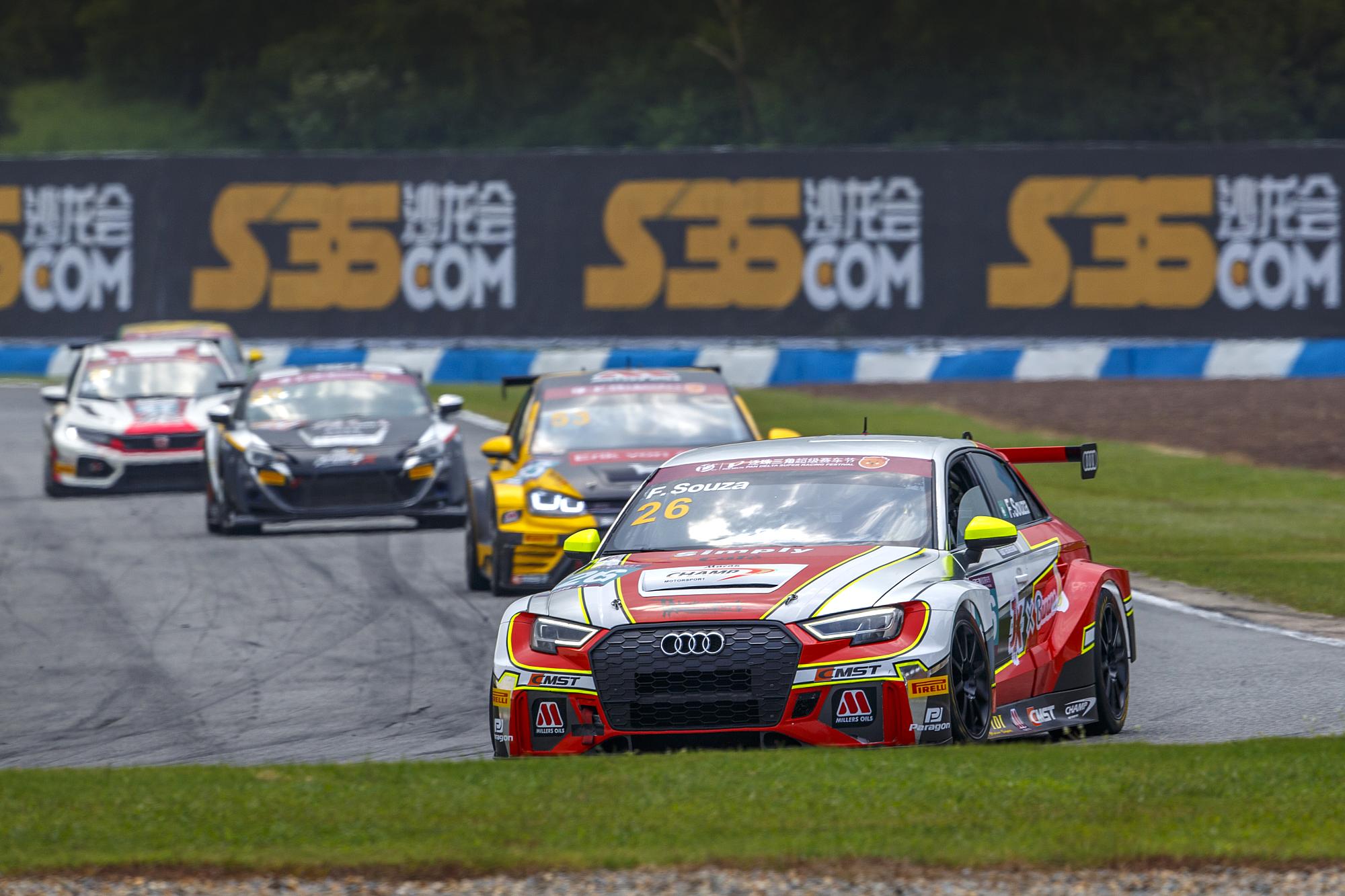 上午10時(shí)40分,比賽正式開始。編隊(duì)圈完成后,比賽采用滾動(dòng)發(fā)車,28號(hào)巴達(dá)華高(J.Badaraco)憑借強(qiáng)勢的起步迅速搶奪到了第一的位置,26號(hào)蘇沙(F.Souza)緊隨其后,TRC車隊(duì)的27號(hào)李家禧第三。一圈之后,蘇沙(F.Souza)憑借賽車的優(yōu)異性能,在最后一個(gè)彎道晚剎車從內(nèi)線超越巴達(dá)華高(J.Badaraco),奪回第一,并逐漸拉開差距。