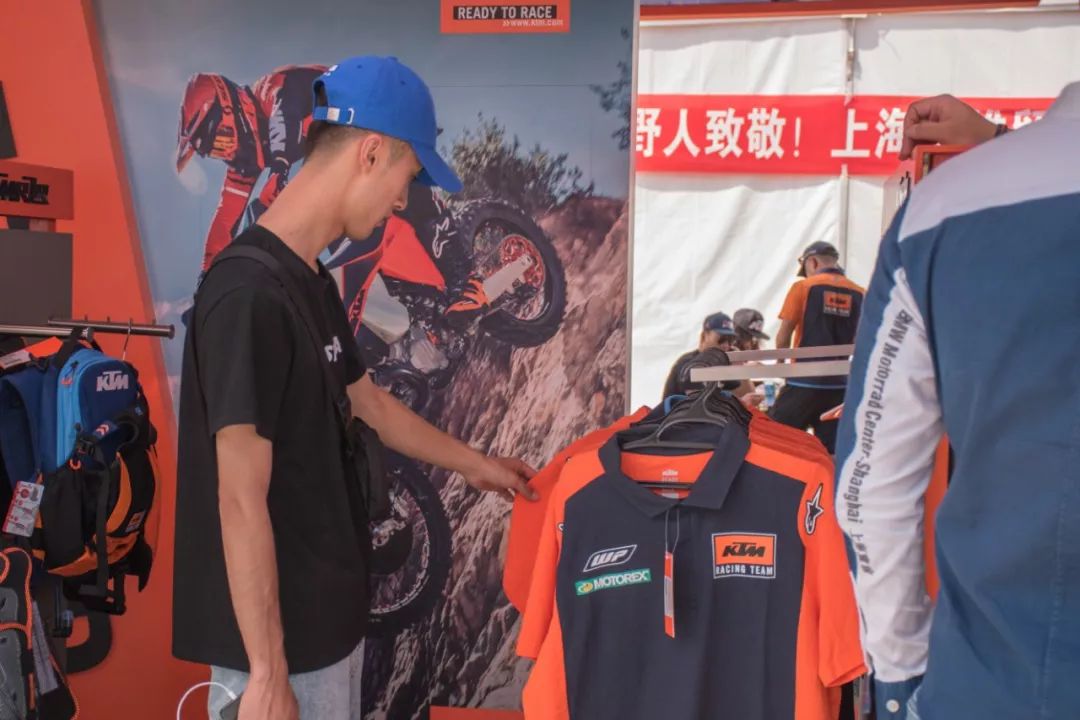 現(xiàn)場KTM展臺上的商品也是銷售的異?;鸨胁簧佘嚸耘c自己心中夢想之車合影留念。