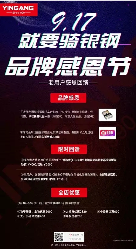 將堅(jiān)持參加,展場精致而重點(diǎn)突出自身優(yōu)勢車型,全方位產(chǎn)品,工廠試騎體驗(yàn),同時(shí)開展“9.17就要騎銀鋼 品牌感恩節(jié)”活動(dòng)。