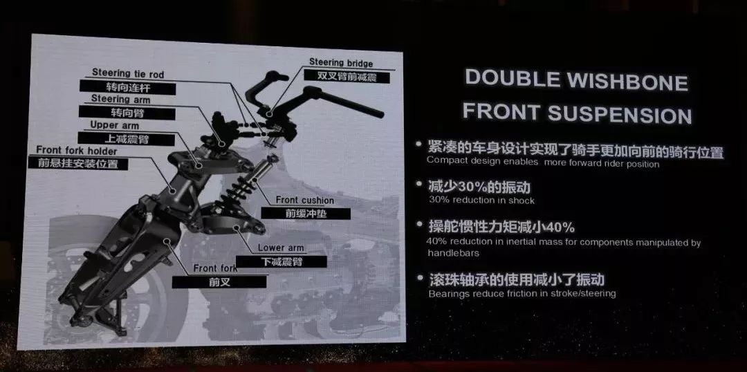 當(dāng)然新金翼最重要的大升級(jí)還是在于前叉結(jié)構(gòu)的大改,新金翼放棄了此前40來(lái)年一直使用的套筒前叉結(jié)構(gòu),改用上業(yè)界很少見(jiàn)的雙叉前減震,大大掃清了金翼曾經(jīng)“老氣橫秋”的印象,增添了很多現(xiàn)代氣息。在常規(guī)的套筒前叉結(jié)構(gòu)中,路面?zhèn)鬟f給車(chē)把的沖擊很大。而新的前懸掛通過(guò)獨(dú)特的雙叉臂結(jié)構(gòu)功能,以及再?zèng)]有傳統(tǒng)前叉的內(nèi)管和外管摩擦,有效減輕了路面?zhèn)鬟f給車(chē)把的沖擊。