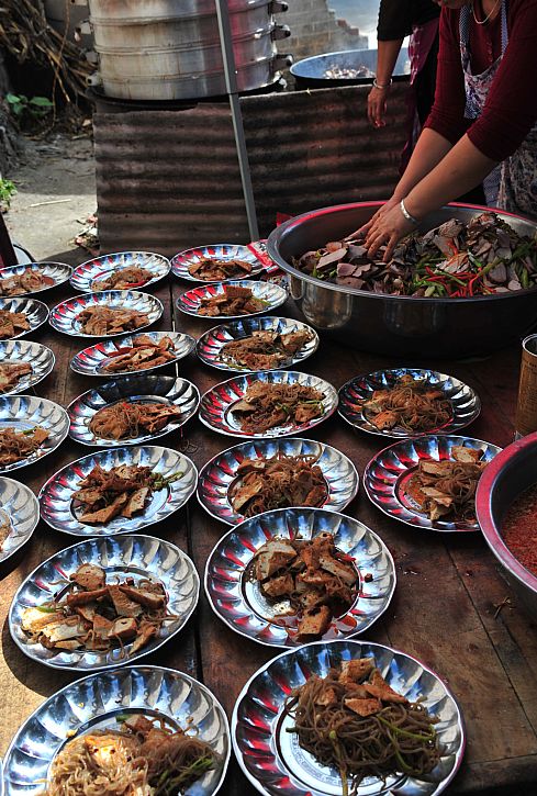 晚上就住在老街中心一家兼營(yíng)食宿的客棧里,細(xì)心的店主還主動(dòng)把我的摩托車推進(jìn)了店堂中存放。晚餐以山里的野菜為主,又為小狗妮要了一塊瘦肉。爺倆都是狼吞虎咽……