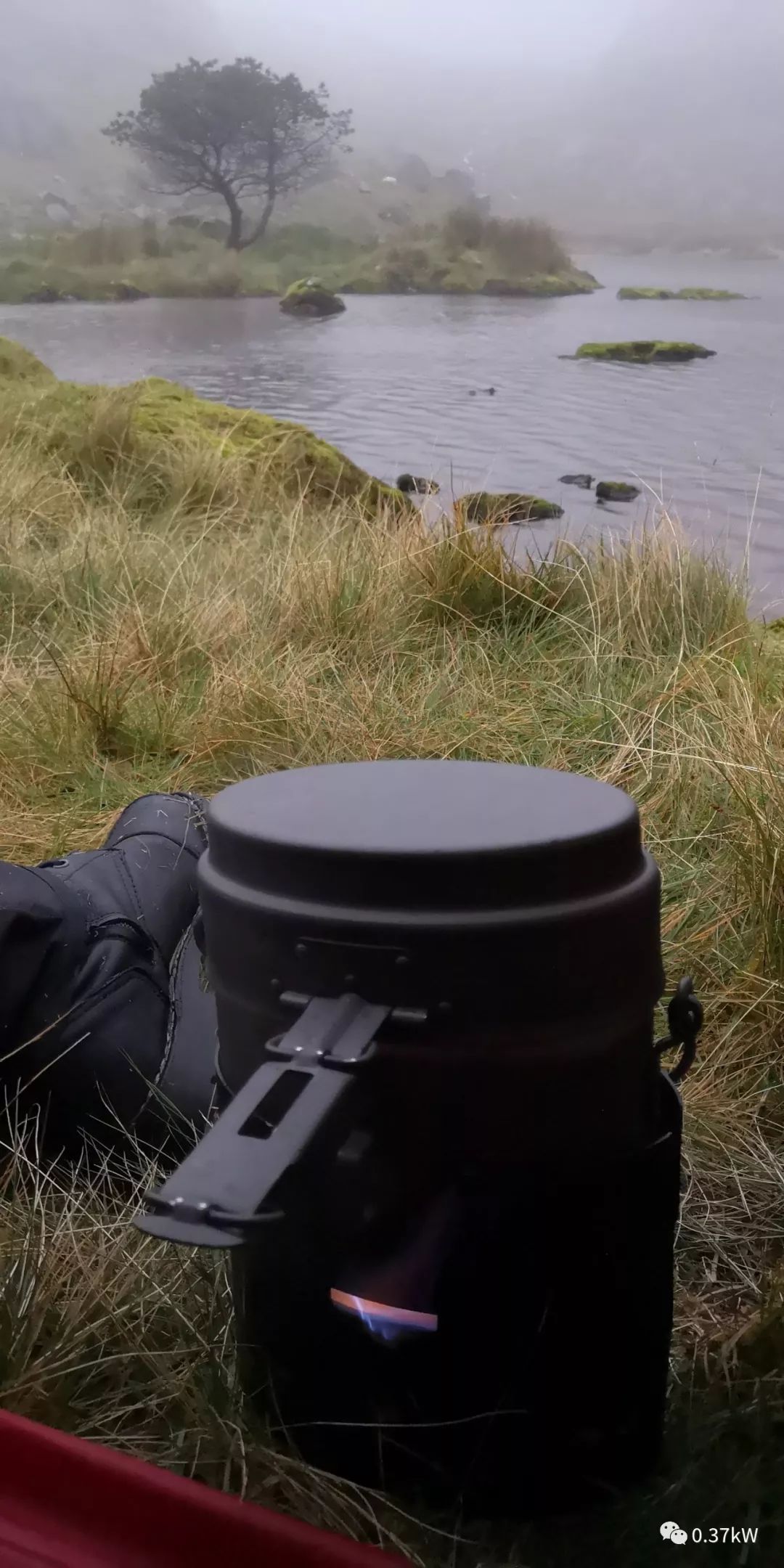 到了半山腰的Llyn Glas,起濃霧刮風(fēng)下雨,不能上也不知道怎么下去,身上濕冷,扎帳篷躲雨取暖。