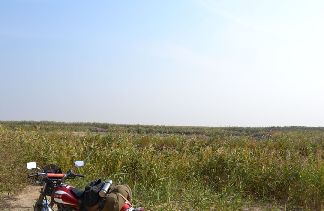 金湖這一夜睡得也很難舒服。春、秋兩季氣候涼爽還沒有蚊子,車內(nèi)鋪一張墊子再配一只睡袋即可,睡時(shí)兩個(gè)相對(duì)的車窗微微開點(diǎn)縫隙換氣通風(fēng),過夜時(shí)摩托車則用鐵鏈將車架或車輪與汽車輪轂鎖在一起。摩托車裝車也好解決——筆者的車輕,自己就抱上車了;重一些的車,把SUV的后門掀開,搭一塊木板,卸車時(shí)順木板倒下來,裝車時(shí)發(fā)動(dòng)起來油門輕輕一擰就上去了。