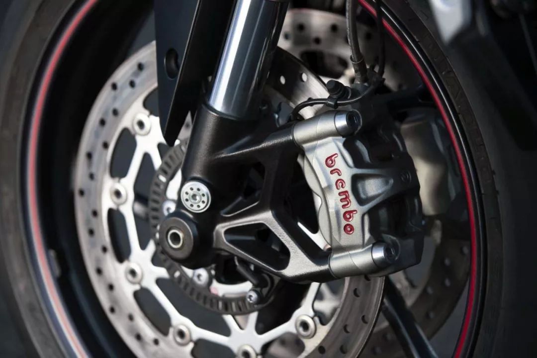 減震系統(tǒng)依舊采用前Showa 41mm倒置前叉,阻尼可調(diào),后減震為ÖhlinsSTX40全可調(diào)單筒減震器。制動(dòng)系統(tǒng)方面配備的是前一對(duì)Brembo M50對(duì)向四活塞卡鉗配310mm雙浮動(dòng)盤,后制動(dòng)為Brembo單活塞卡鉗配220mm制動(dòng)盤。輪胎為倍耐力最新一代Diablo Supercorsa SP V3。而新款在儀表上也做了升級(jí),增加了MyTriumph系統(tǒng),可以跟手機(jī)進(jìn)行連接,可以實(shí)現(xiàn)逐行導(dǎo)航、音樂控制、接聽電話等操作,更加方便。而在電控系統(tǒng)方面,新款Street Triple 765 RS配有五種騎行模式選擇,可調(diào)節(jié)牽引力控制系統(tǒng)以及ABS系統(tǒng),這些配置也讓這款車更加智能化。