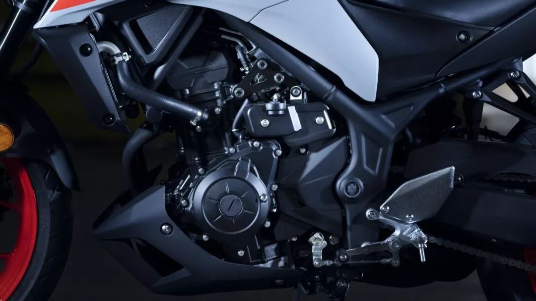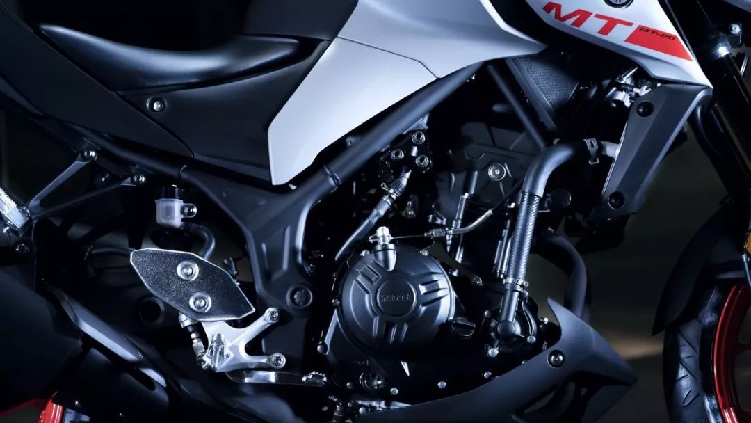 新的 MT-25 沿用了此前的水冷四沖程直列兩汽缸、DOHC 每汽缸四汽閥的發(fā)動機,缸徑、行程為 60 mm × 44.1 mm(MT-03 的缸徑、行程為 68 mm × 44.1 mm),排汽量 249 cc,最大動力輸出 26.5 kw(約 35 匹。而 MT-03 的最大動力輸出為 31 kw)。