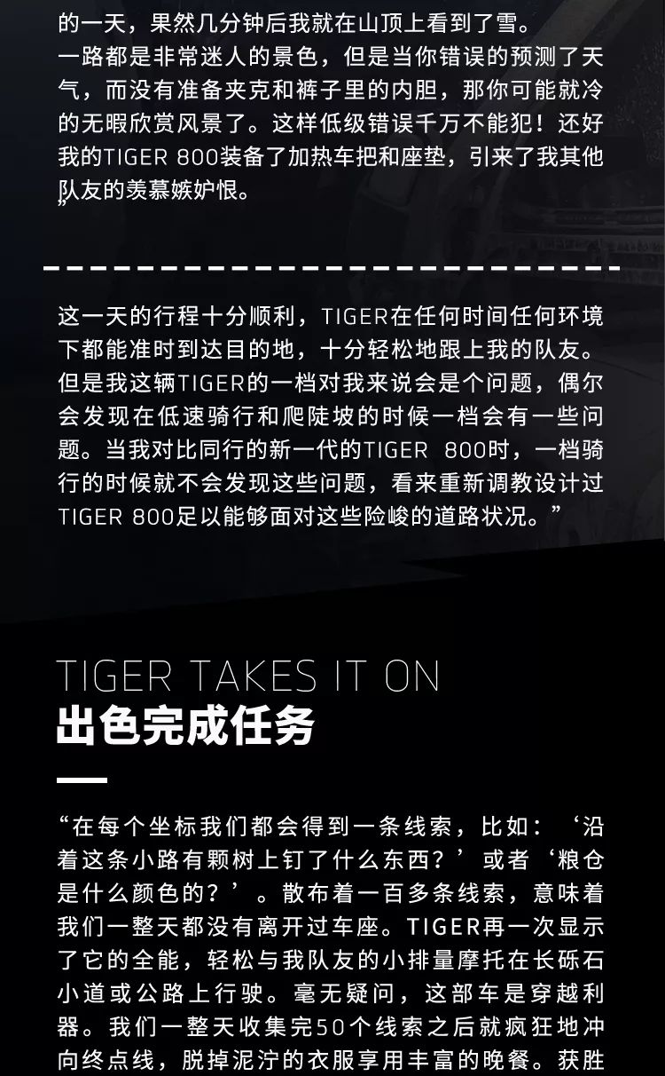 核心提示:猛虎出山,氣吞萬(wàn)里更多探險(xiǎn),等你征服#For the Ride#Tiger 800 XCA 現(xiàn)已開售左滑下圖,查看現(xiàn)售車型