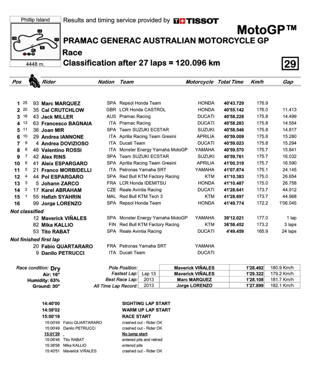 比賽的賽程是 27 圈、合計約 120.096 公里。進入正式比賽的第一圈,駕駛 9 號車的佩魯奇(Danilo Petrucci)在車群中 High Side 高位摔倒,并波及了寇塔拉羅,兩人雙雙退出了競爭。