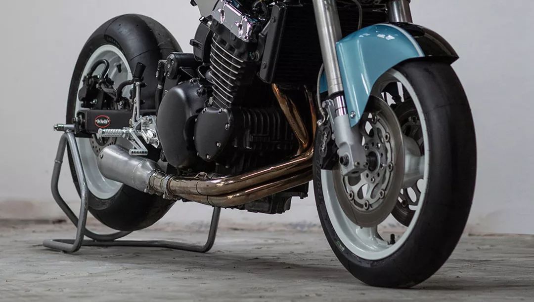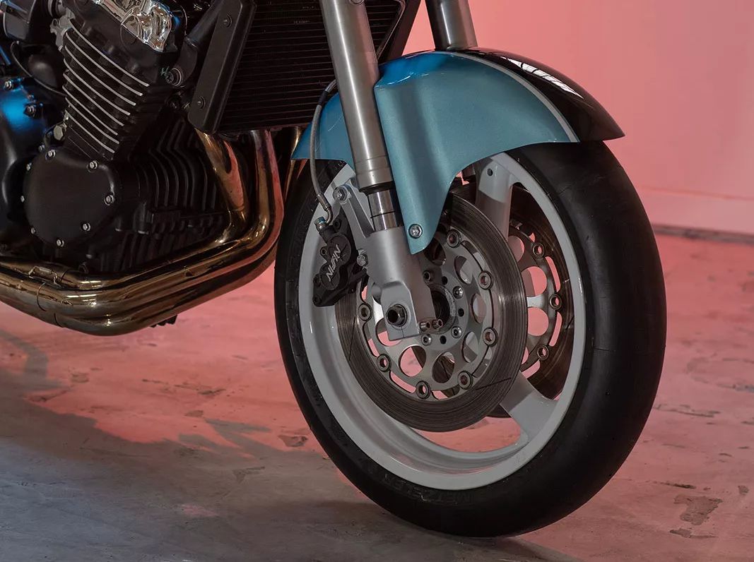 整臺(tái)車除了車架、油箱、引擎之外,幾乎全部定制,前叉由GSX-R1000的43mm倒置式所取代,前后輪轂則是換上了GSX-R1000的三幅輪框以及專用競(jìng)技輪胎,而后制動(dòng)系統(tǒng)則是采用直線加速賽必備的加長(zhǎng)搖臂以及NISSN原廠卡鉗。