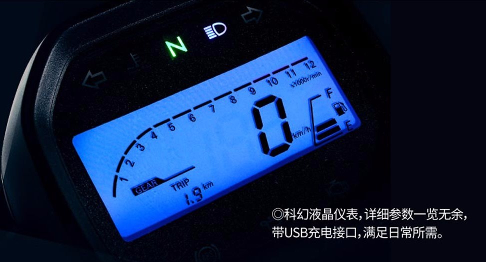 單色LED液晶儀表,和無(wú)極300AC保持一致,面積不大只能說(shuō)夠用,談不上科技感。