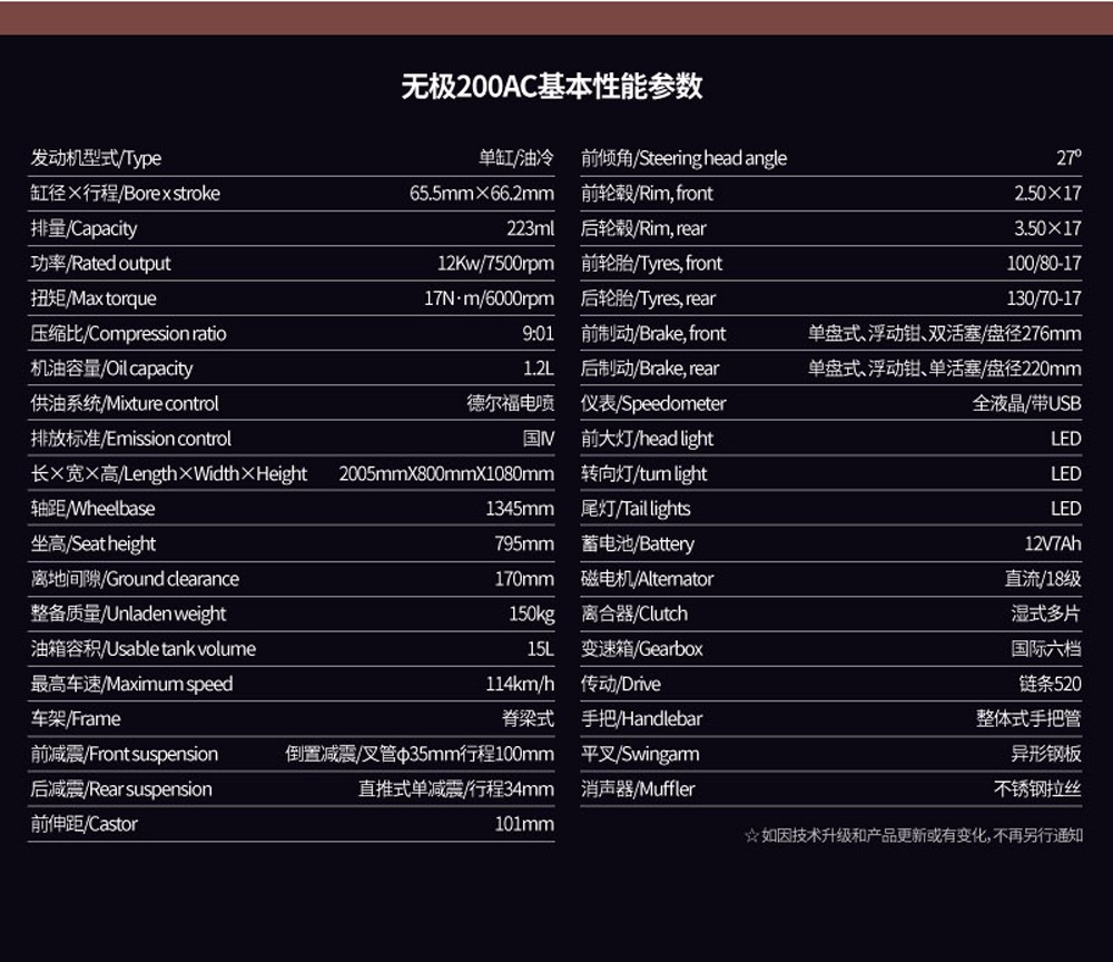 附:無(wú)極200AC參數(shù)配置表