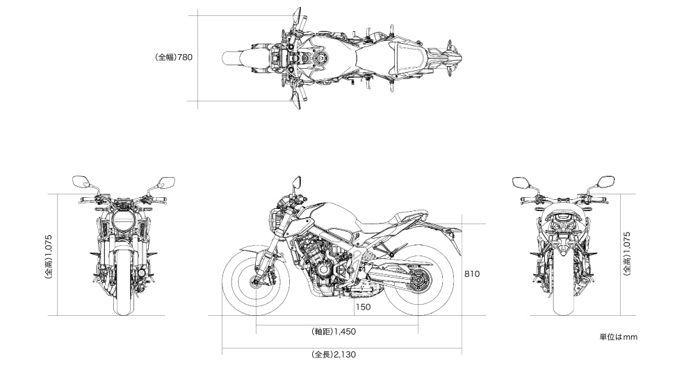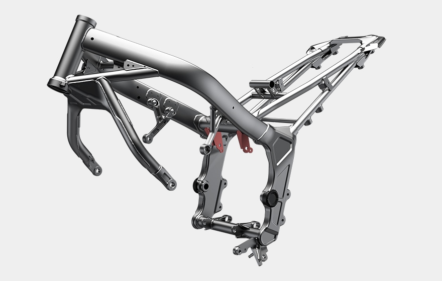 采用有助于減輕重量和集中質(zhì)量的框架,CB650R的車架為雙管形式,利用鋼的柔順特性的同時(shí)實(shí)現(xiàn)高效的向下氣流進(jìn)氣布局,采用擺臂樞軸,發(fā)動(dòng)機(jī)吊架結(jié)構(gòu)和短座椅導(dǎo)軌,實(shí)現(xiàn)了重量輕,質(zhì)量集中的目的。