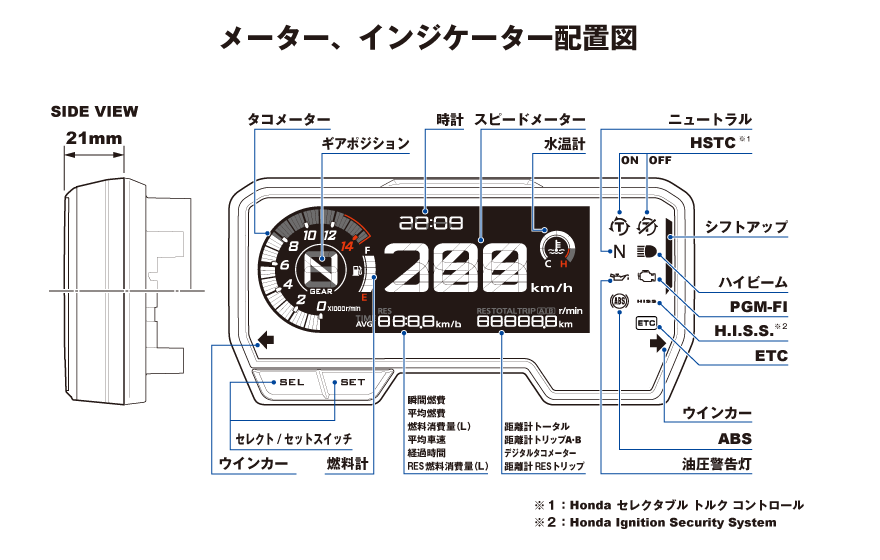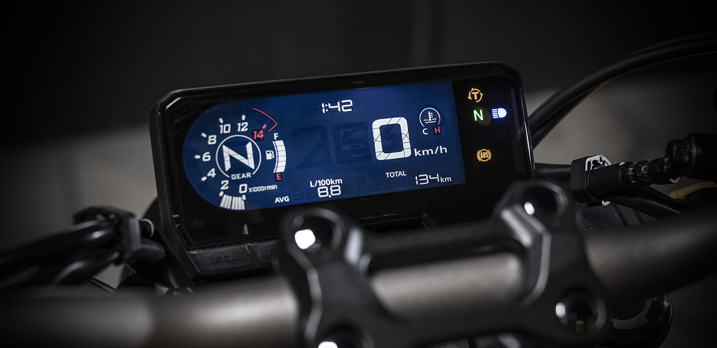 CB650R采用了全平面設(shè)計(jì),通過(guò)用透明丙烯酸覆蓋顯示器表面來(lái)最大化液晶尺寸,具備檔位指示器,水溫表,發(fā)動(dòng)機(jī)轉(zhuǎn)速,車輛時(shí)速等等顯示,以及鏈接發(fā)動(dòng)機(jī)轉(zhuǎn)速并通知換擋正時(shí)的升檔指示器。