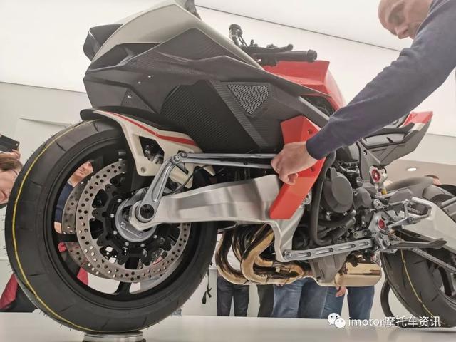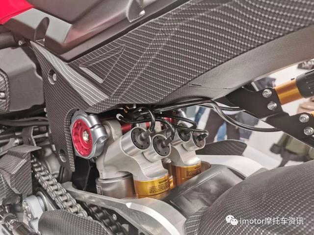 與Bimota合作的首款車型,那么Bimota的標(biāo)志性前搖臂結(jié)構(gòu)自然是少不了, Bimota的前端設(shè)計(jì)將轉(zhuǎn)向和懸架分開(kāi)。兩副減震器安裝在車架的后部,一個(gè)減震器連接到一個(gè)聯(lián)動(dòng)系統(tǒng),該系統(tǒng)沿左側(cè)延伸到前搖臂。
