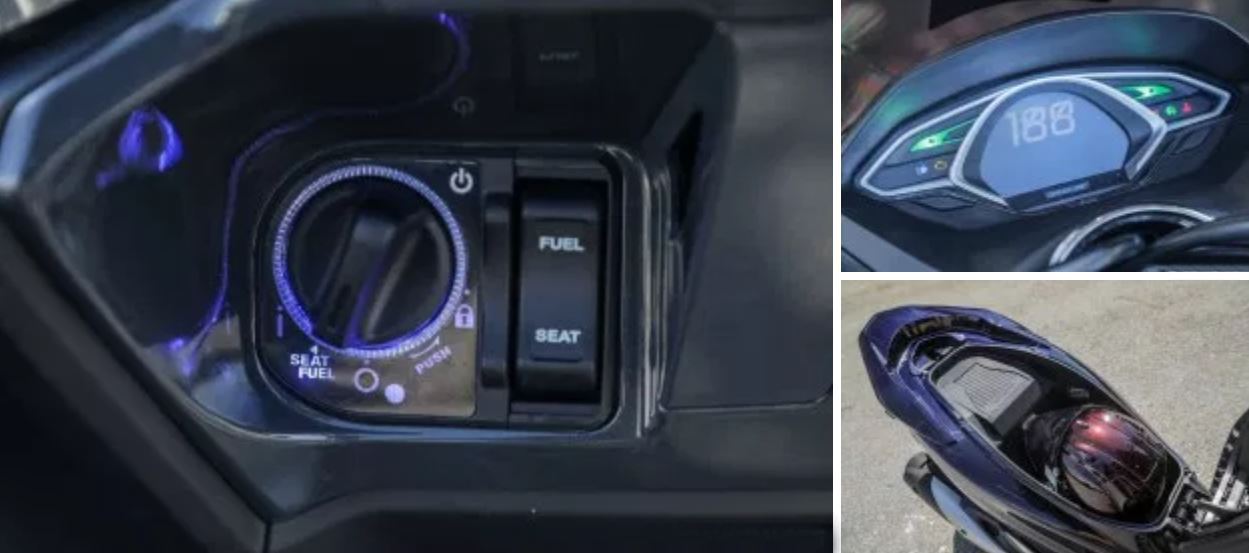 PCX 150的啟動(dòng)和打開是通過旋轉(zhuǎn)開關(guān),該開關(guān)還能控制座椅或加油口蓋的開閉,我們喜歡無鑰匙啟動(dòng)和遠(yuǎn)程打開開關(guān)的便利性。雖然無鑰匙啟動(dòng)很方便,但是會(huì)帶來一個(gè)問題,如果PCX上的電池電量耗盡,會(huì)發(fā)生什么情況?在這種情況下,將需要PCX隨附的特殊磁性鑰匙,該磁性鑰匙用于手動(dòng)將開關(guān)轉(zhuǎn)到主旋轉(zhuǎn)開關(guān)右側(cè),從而使騎手可以抬起座椅。