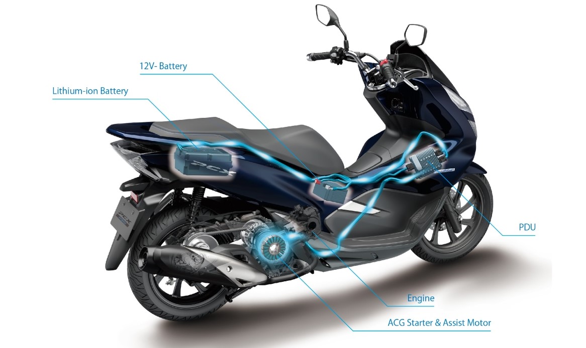 PCX Hybrid混合動(dòng)力車,增加了48伏電動(dòng)機(jī)和鋰離子電池,這使PCX Hybrid的重量增加到134 kg,而電動(dòng)機(jī)在3,000 rpm的轉(zhuǎn)速下提供了額外的1.9 hp和4.3 Nm的扭矩。