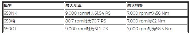 CFMOTO 300NK搭載292.4cc的單缸,水冷,DOHC,4氣門發(fā)動機(jī),在7200轉(zhuǎn)提供33.9 PS的峰值功率,在8800rpm時提供20.5Nm的最大扭矩。650系列使用649.3cc并列雙缸水冷發(fā)動機(jī),在下表中可查看650車型的峰值功率和扭矩數(shù)據(jù):