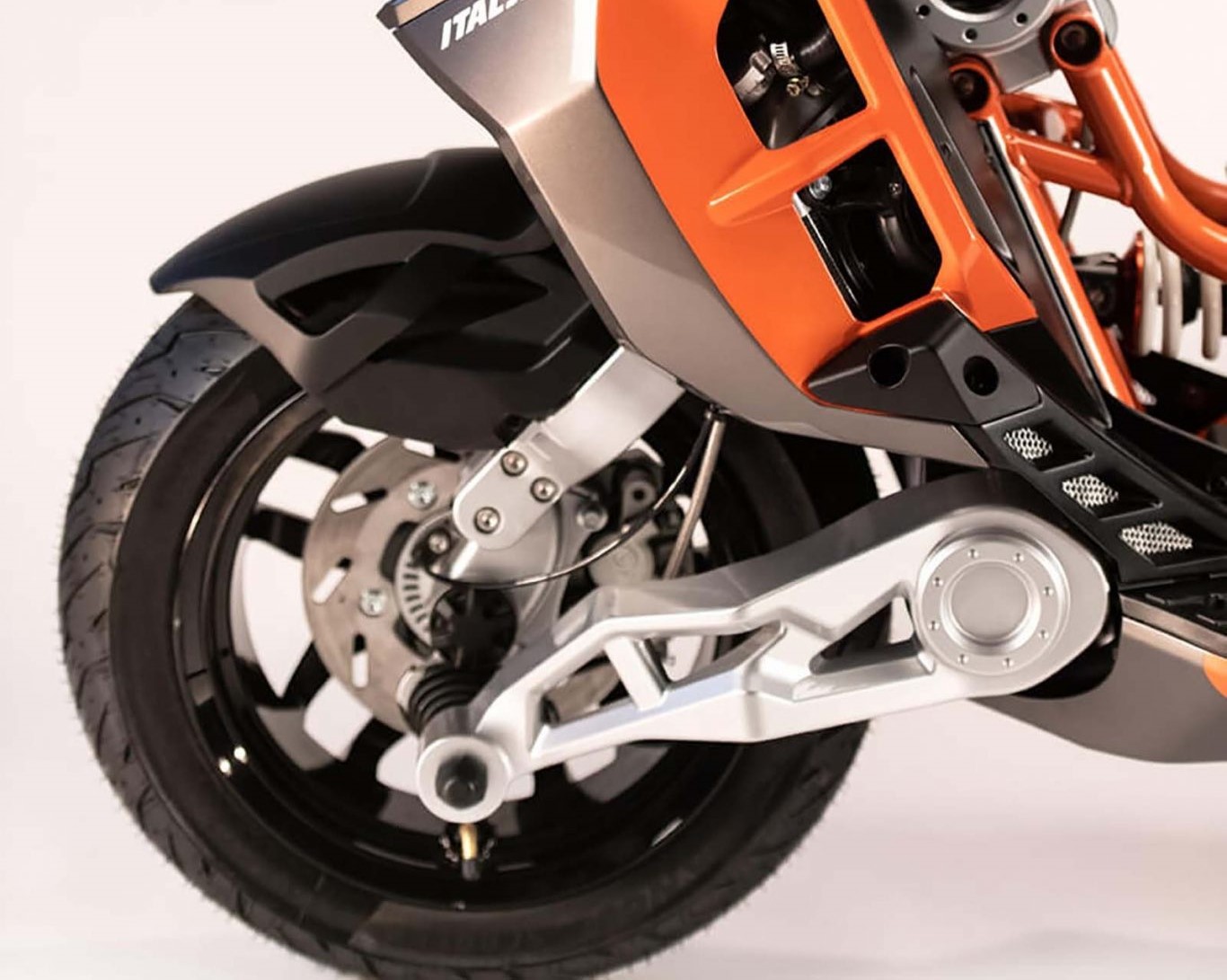 前轉(zhuǎn)向系統(tǒng)與BIMOTA類似,Italjet將該系統(tǒng)稱為獨立轉(zhuǎn)向系統(tǒng)(ISS),并已由Italjet工程師與Pontedera的EDI共同申請專利,該轉(zhuǎn)向系統(tǒng)通過將轉(zhuǎn)向作用與懸架作用分離開來,以過濾不平坦路面的震動引導(dǎo)振動和節(jié)拍同時傳遞給車輪。