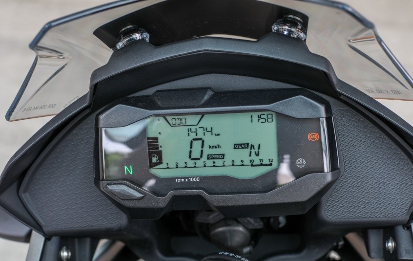 在駕駛臺(tái)部分,有一個(gè)單色LCD儀表,純黑色讀數(shù)清晰易讀,面板上顯示了騎手需要知道的所有內(nèi)容,不過科技感方面就沒有全彩TFT來的那么強(qiáng)烈。