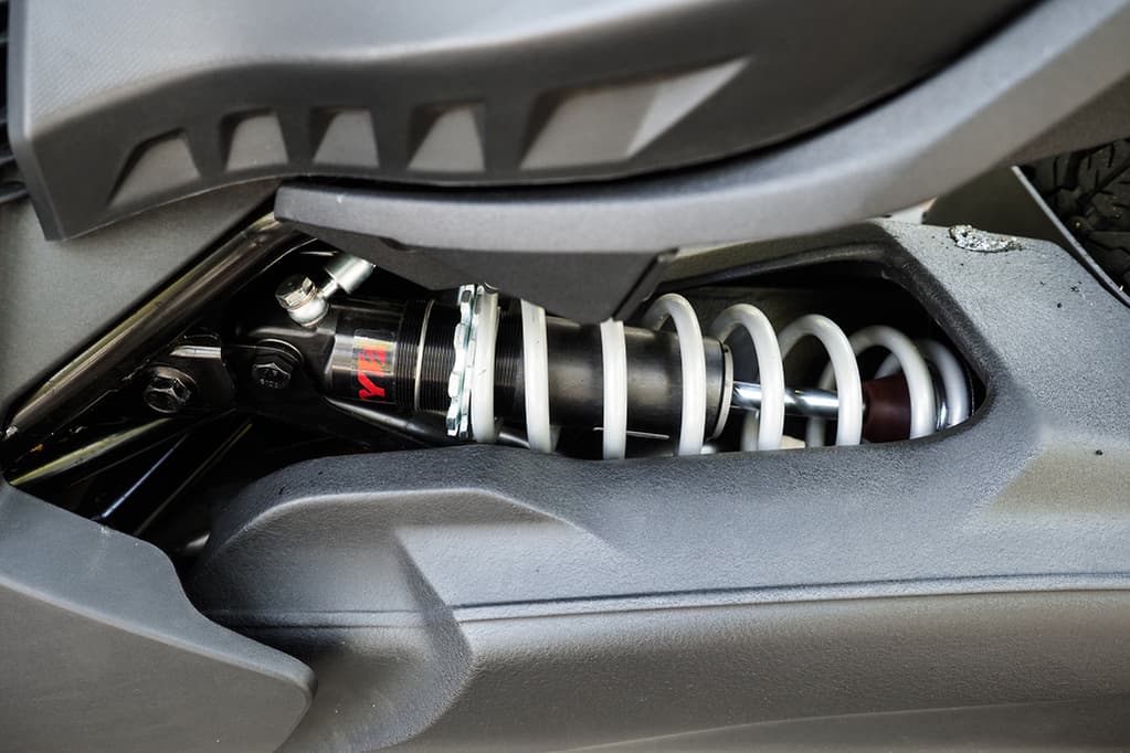懸掛是通過三個(gè)雙管薩克斯避震來實(shí)現(xiàn)的,前部有一個(gè)不可調(diào)節(jié)的雙A臂裝置,后部有一個(gè)橫向多連桿(和預(yù)載可調(diào))裝置。