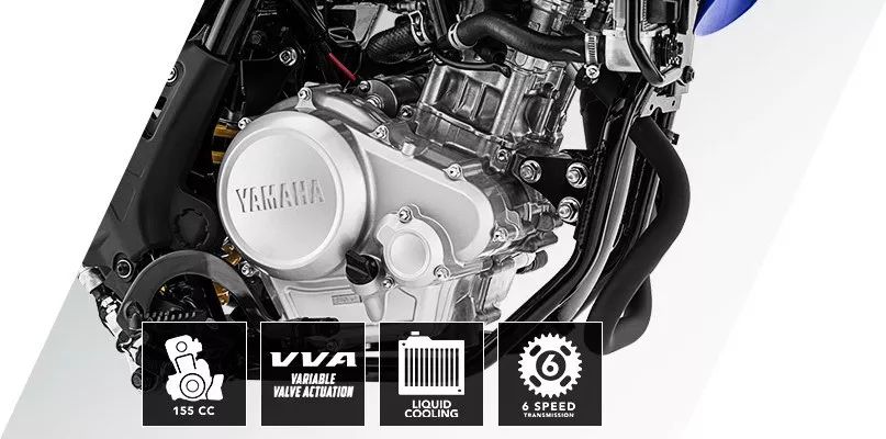 新的 WR155 搭載一副來自入門級跑車 YZF-R15 平臺的水冷四沖程單汽缸、SOHC 四汽閥 VVA(可變汽閥正時控制)的發(fā)動機,缸徑、行程為 58 mm x 58.7 mm,排汽量 155.1 cc。配備了電子燃油噴注系統(tǒng)、六檔的變速齒輪箱,最大動力輸出 12.3 kw(約 16.7 匹。而 YZF-R15 的最大動力輸出為 14.2 kw)。