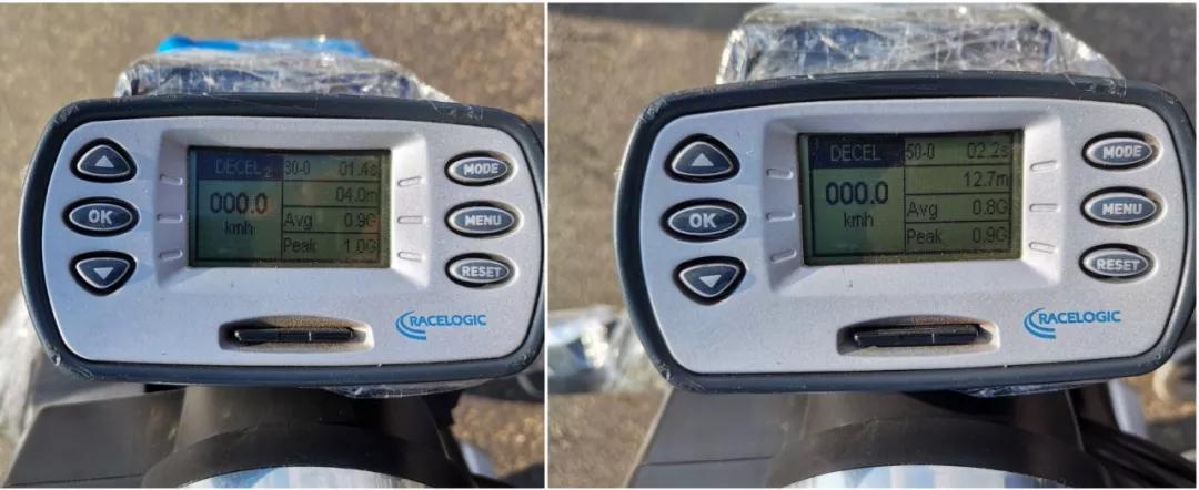 在道路上測試緊急大力制動時,容易出現(xiàn)后輪側(cè)滑的現(xiàn)象(正常剎車不會),但數(shù)據(jù)上仍然是同級別的較好水準(zhǔn),在50km/h-0的最好制動距離為12.7 m,而30km/h-0的最好制動距離4.0m。同樣,前輪的ABS工作介入時機較晚,在實際的緊急制動過程中,前剎車的行程約捏下到3分之2處,ABS才開始介入工作,感覺ABS泵工作時間隔時間較長,但制動效果不錯。