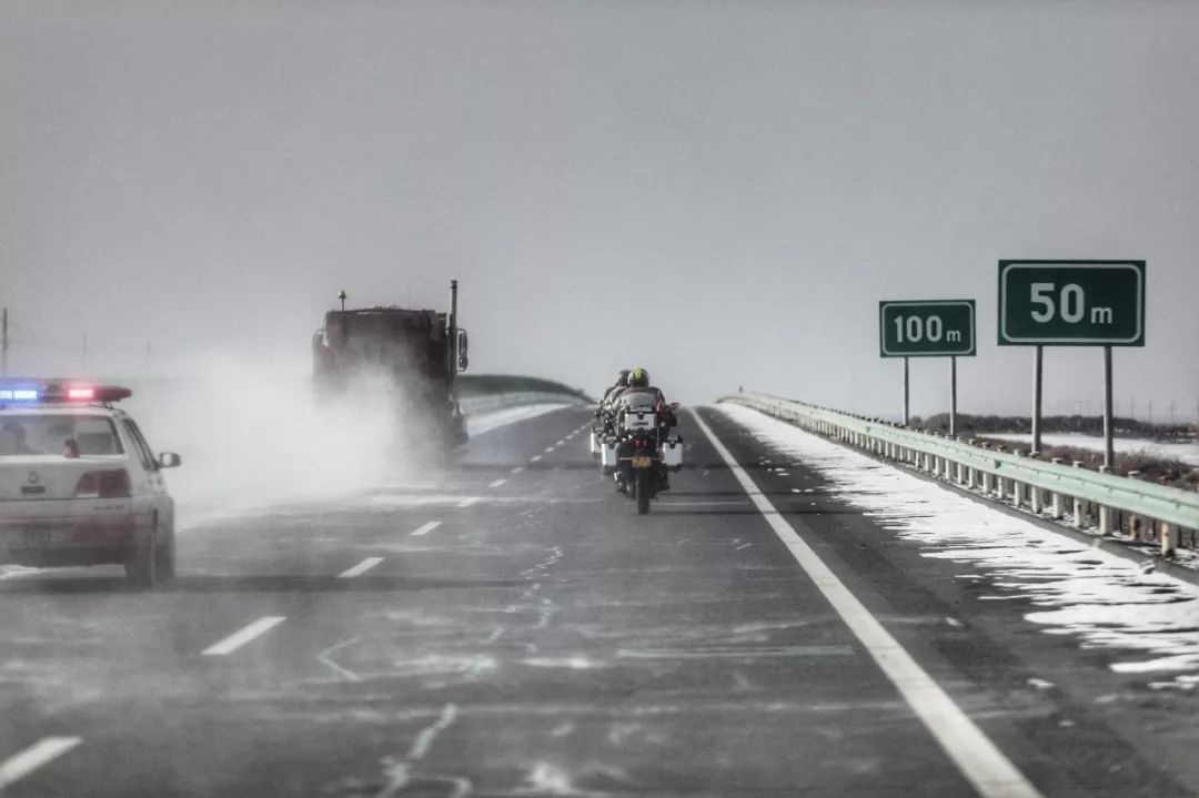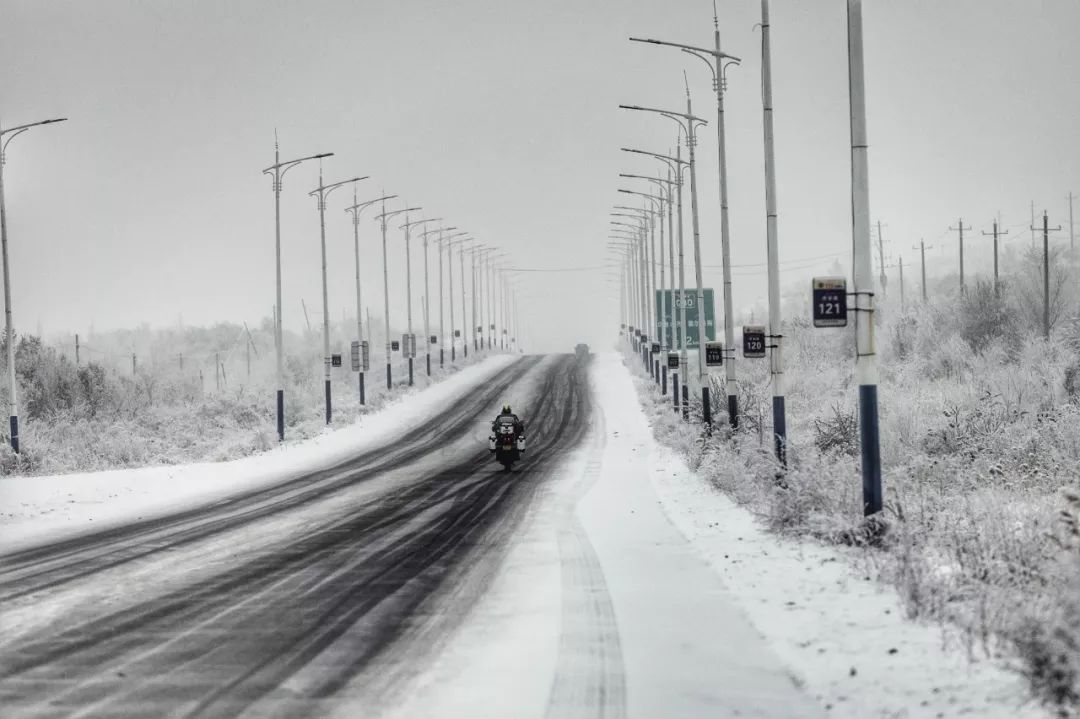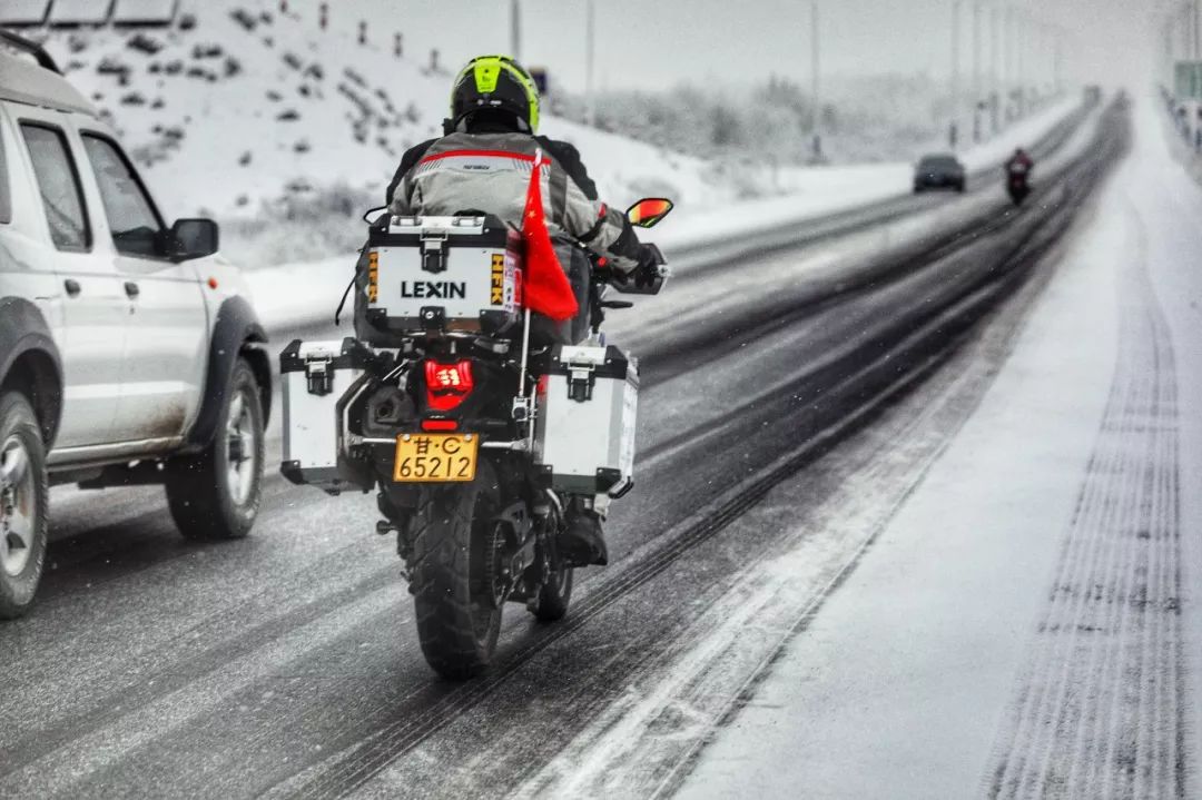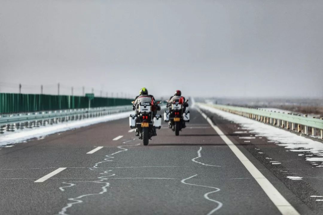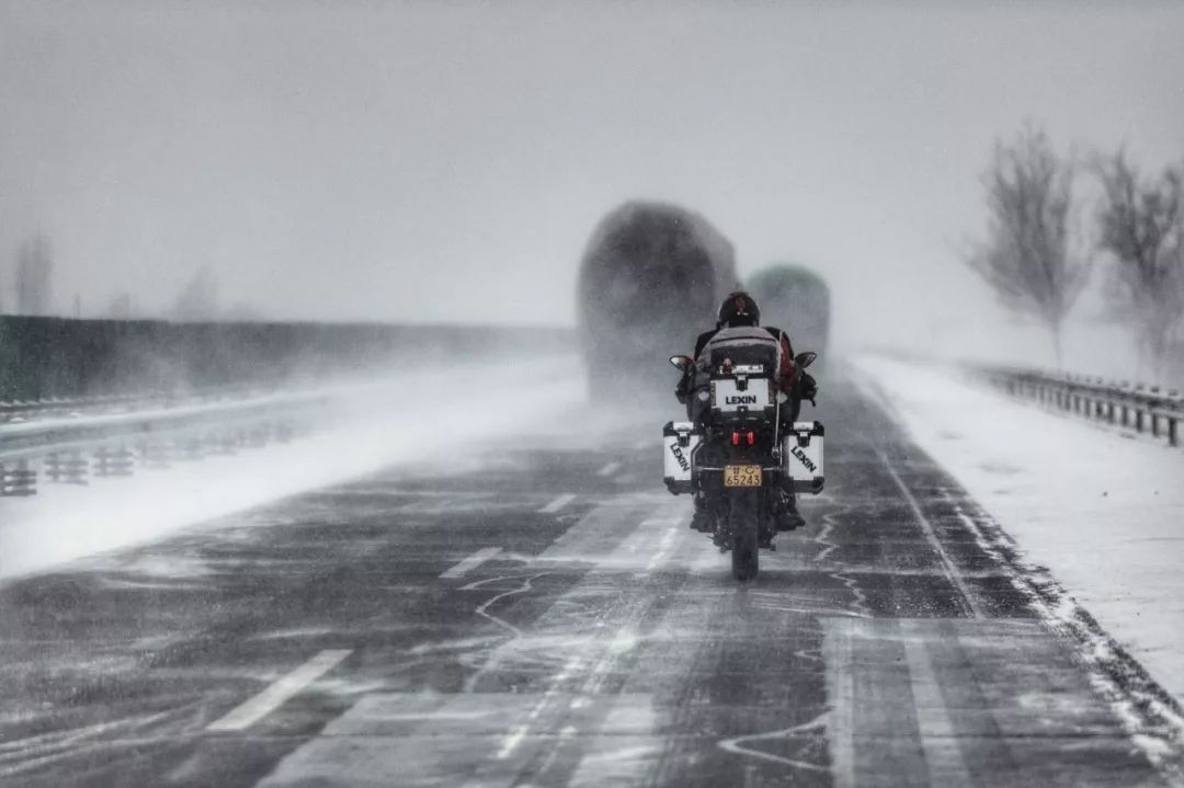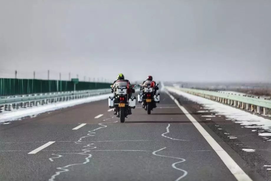越痛越不動聲色,越苦越保持沉默。因為下雪,路面特別的滑,我們騎行的時候是小心謹慎,生怕滑倒,好不容易默默的堅持到了高速,雪是越下越大,好在高速上面沒有積雪,行駛的車輛把路面的雪帶到了兩邊,路面中間幾乎是干的,保障車在前面開路,兩輛摩托車跟隨在后面。