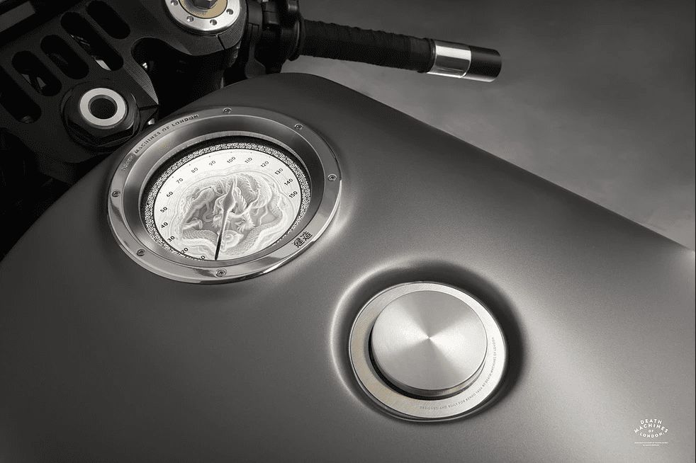 這部車在許多細(xì)節(jié)處也充滿了創(chuàng)意,例如嵌入油箱上方的儀表盤,就特別注入了18世紀(jì)日本珠寶盒的特征,表面甚至還蝕刻出一條精致的龍。頭燈和尾燈雖然都是由Death Machines of London自行設(shè)計(jì),但是內(nèi)部的LED卻是借助了加州Luminit的技術(shù),因而讓光源能夠更均勻且清楚的分布于整個(gè)燈體上。