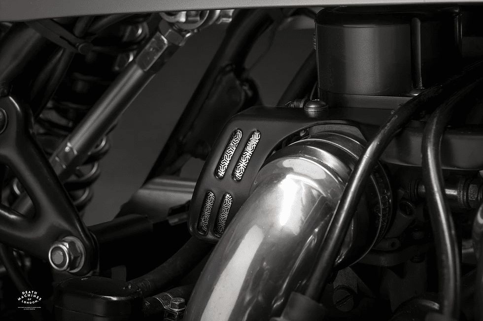 外觀部份,Death Machines of London特別運(yùn)用了許多高科技制作技術(shù),例如從前叉到油箱都被完整包覆的外觀件,就是以3D打印的符合材質(zhì)結(jié)合輕量化鋁材。若從側(cè)面來看,油箱上的俐落線條不難聯(lián)想正是擷取自日本武士的鎧甲而來,前叉則是以鋒利的武士刀為設(shè)計(jì)靈感。至于缸頭、進(jìn)氣岐管到底下的排氣管都完整露出的引擎,則更巧妙凸顯出GL1000水平對臥引擎的對稱美感。