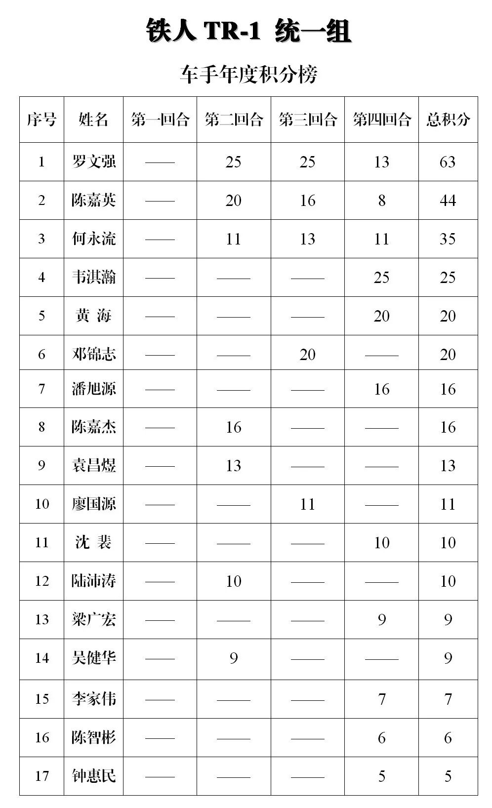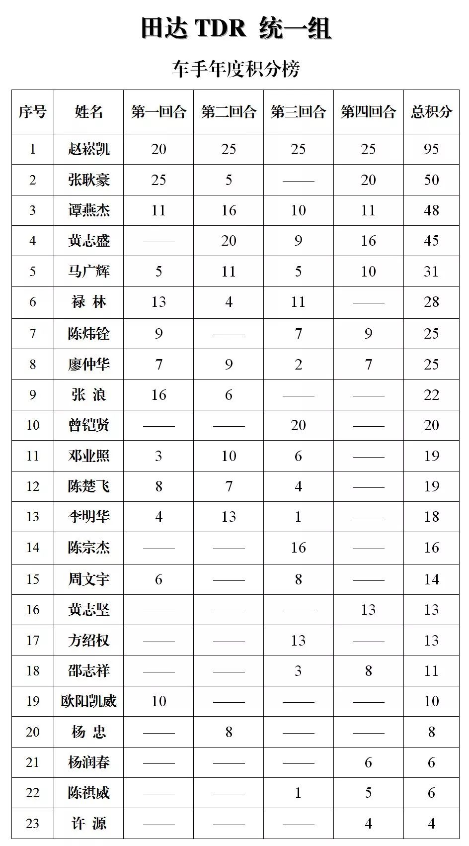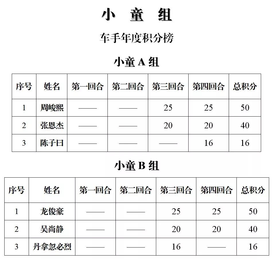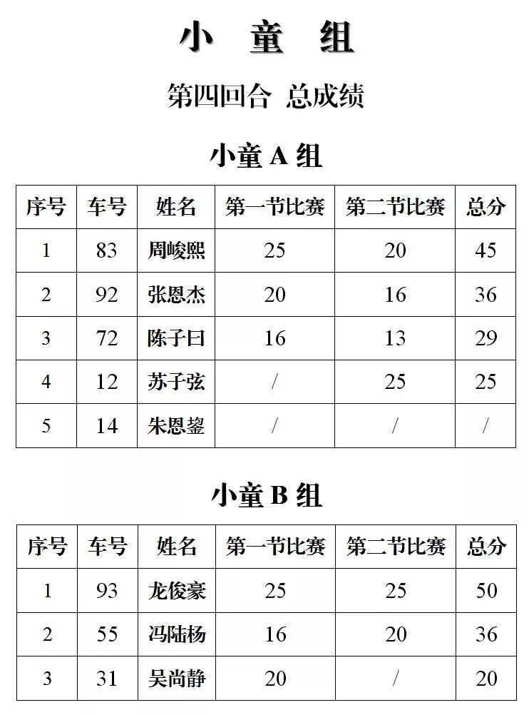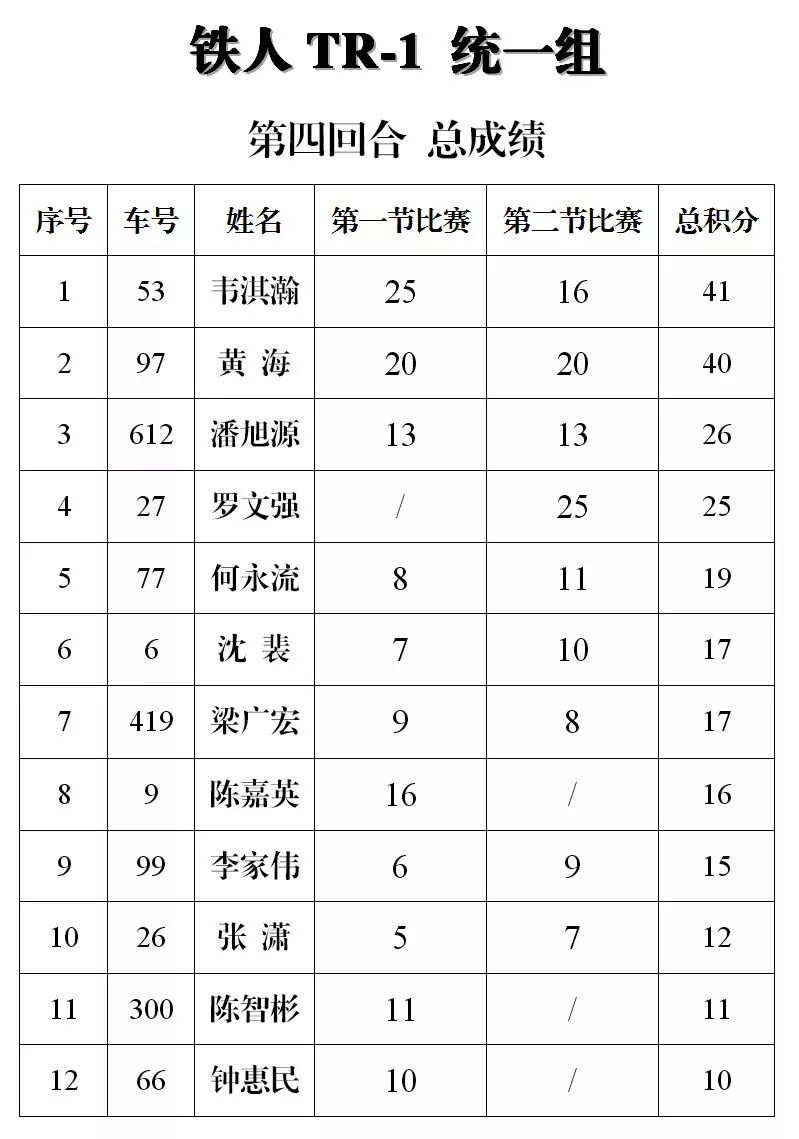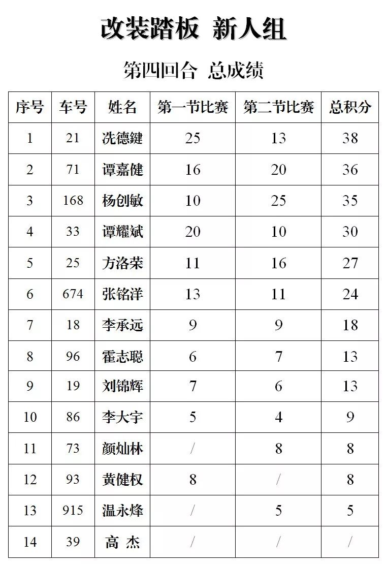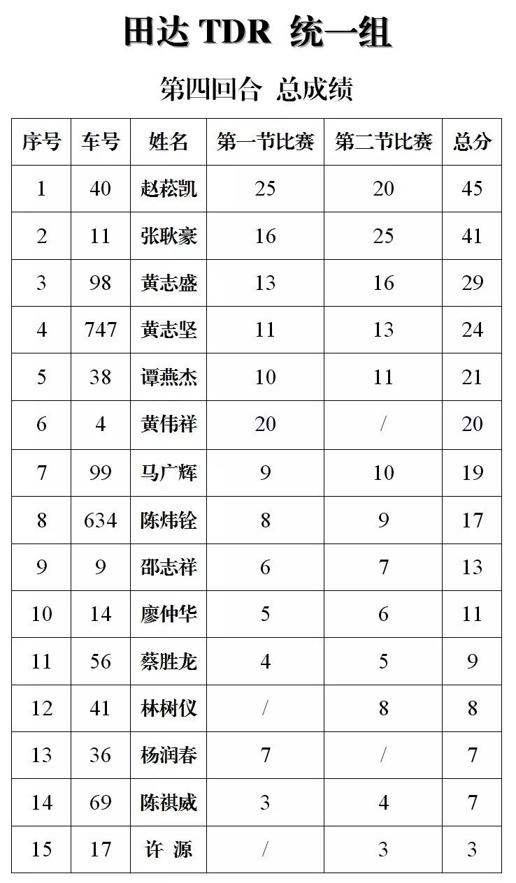 下面的圖片,改裝踏板新人組、鐵人 TR-1 統(tǒng)一組、田達(dá) TDR 統(tǒng)一組、小童組(A、B 組混合),第四回合的比賽成績(jī)、以及全年度總成績(jī)(車手積分榜)。