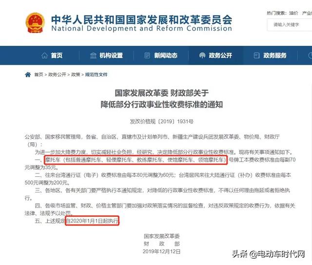 近日,國家發(fā)改委會同財政部印發(fā)了《關(guān)于降低部分行政事業(yè)性收費標準的通知》,一改價格規(guī)定:自2020年1月1日起,摩托車(包括普通摩托車、輕便摩托車等)號牌工本費收費標準由每副70元調(diào)整為35元。