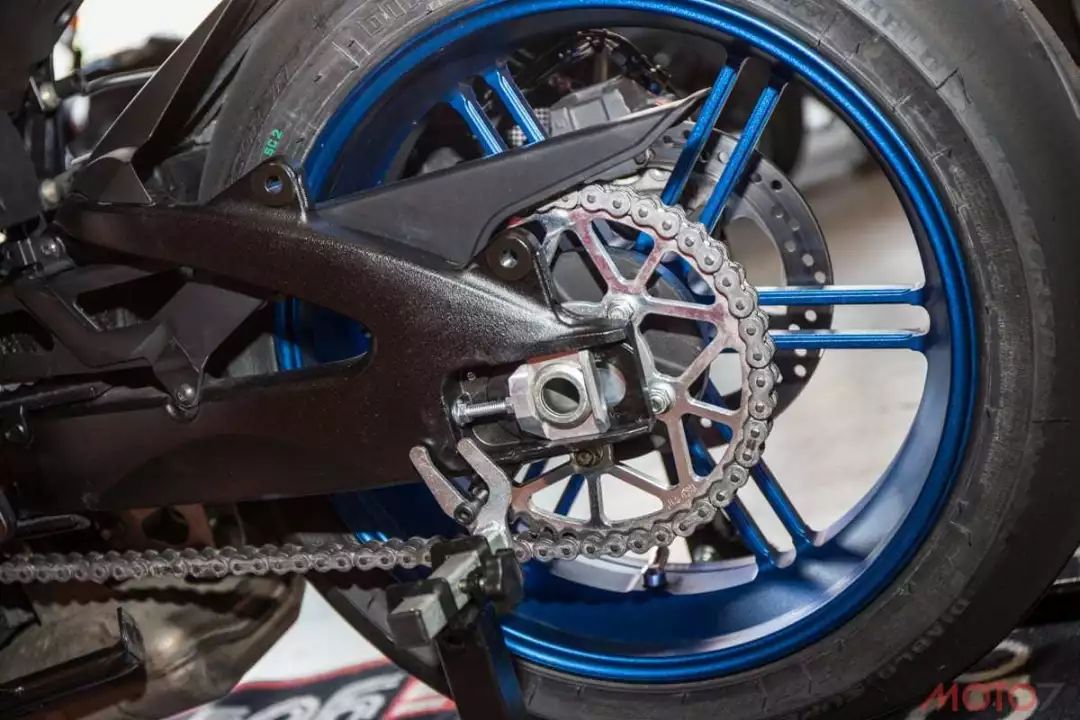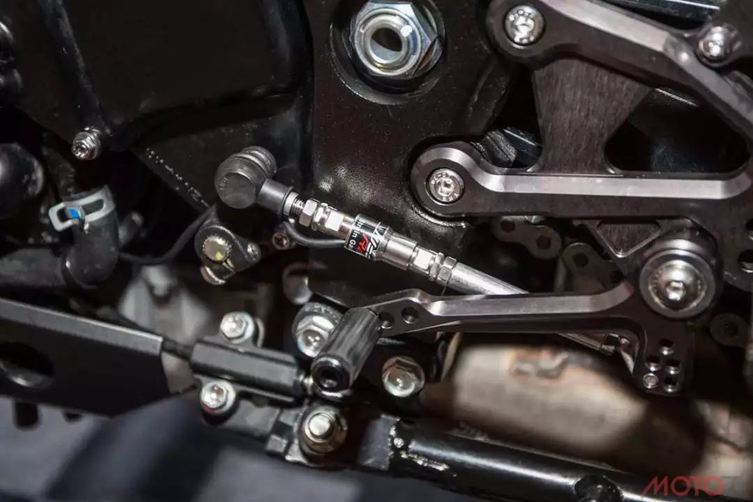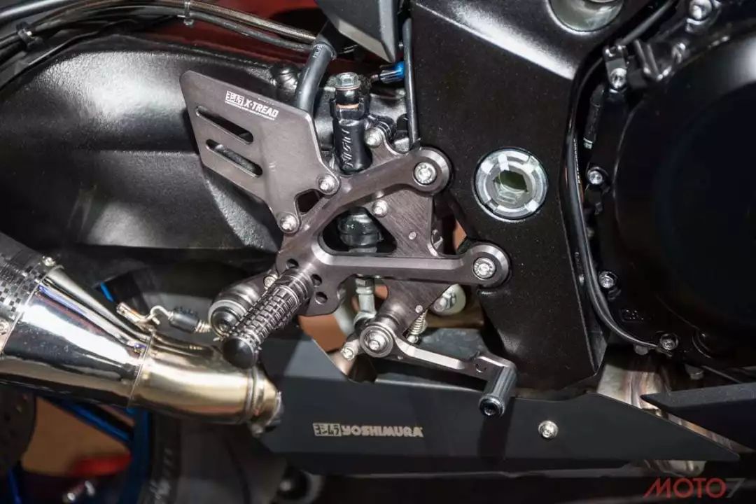 引擎前方的水箱護(hù)網(wǎng)改裝J’S妒的精品,并且在傳動(dòng)的部分配備了KCT鋁合金齒盤,讓車體輕量化再升級(jí)。YOSHIMURA的腳踏后移讓可依照騎士需求調(diào)整,并且制動(dòng)桿也有長短兩段可調(diào)。