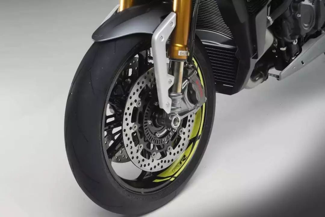 底盤裝置的尺寸與Serie Oro相同,采用了前輪曳引力距97mm、1,415mm的精簡軸距,經(jīng)過TIN表面加工處理的OHLINS制NIX EC前叉在使用時,則是通過電子裝置來調(diào)整控制,彈簧預(yù)載則是需要手動進(jìn)行調(diào)整。