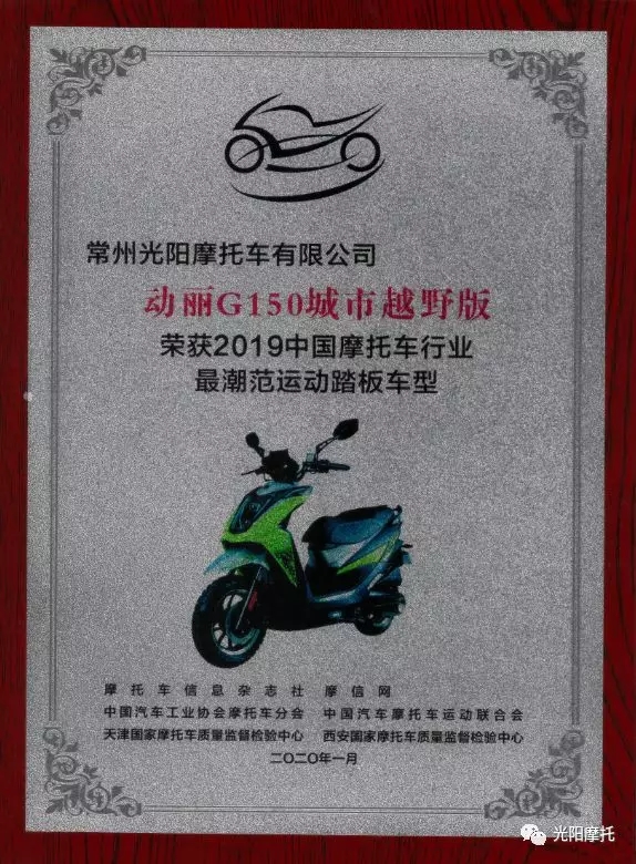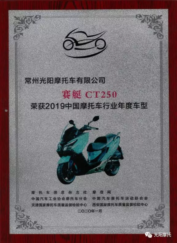 常州光陽(yáng)摩托車(chē)有限公司賽艇CT250和動(dòng)麗G150城市越野版榮獲2019中國(guó)摩托年度車(chē)型和“最潮范”運(yùn)功踏板車(chē)型。