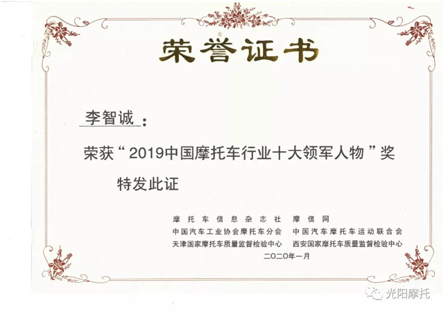 常州光陽(yáng)摩托車(chē)有限公司 副董事長(zhǎng)李智誠(chéng) 榮獲2019中國(guó)摩托車(chē)行業(yè)十大領(lǐng)軍人物