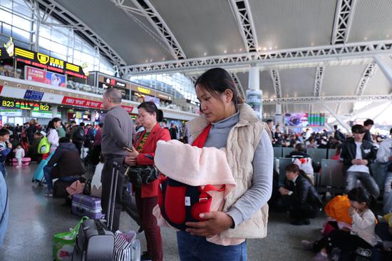 今天還是個(gè)特殊的日子,車上迎來了一位特殊的小乘客。來自貴港的小覃前不久生了個(gè)“豬寶寶”,今天剛好是寶寶滿月,一路上她都很激動(dòng),小寶寶乖巧地躺在懷中,外公外婆已經(jīng)在車站外等候,再過不久就能見到給久違的親人們,分享為人母的喜悅。