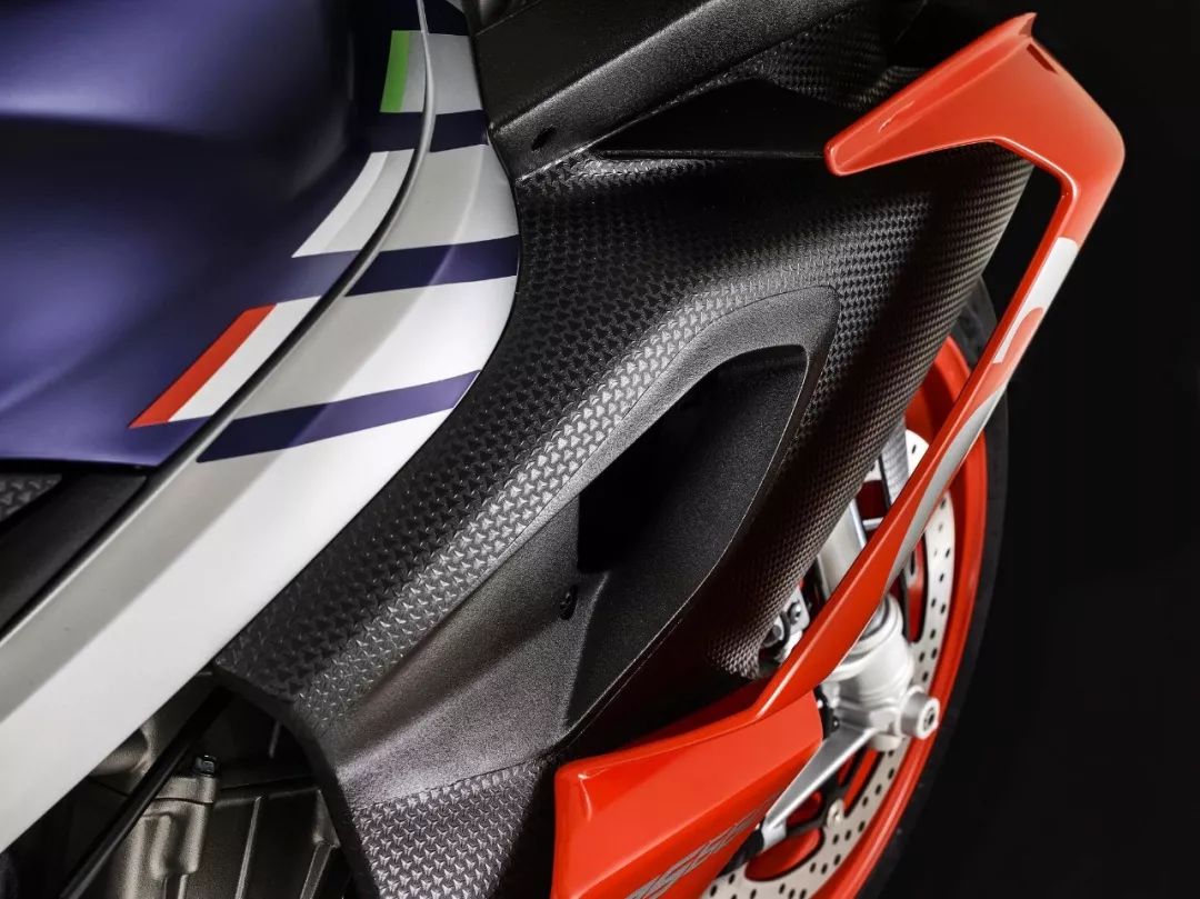 車體方面,采用了一副鋁合金雙翼樑式的車架,整流罩的結(jié)構(gòu)特點(diǎn)明顯是來自 V4 的,前整流罩采用了雙層式的設(shè)計(jì)、并以之作為一個(gè)完整的空氣動力附件。乘坐位置的設(shè)計(jì)考慮到了舒適性,有一個(gè)相對較厚的鞍座,不太高的腳踏位置,以及安裝在前叉上方、稍微上揚(yáng)安裝的車把。而全車重量僅為 169 公斤。在初階段,新車將提供兩個(gè)外觀圖案:一個(gè)是黑色為主調(diào)、襯以紅色的標(biāo)準(zhǔn)圖案;另一個(gè)則是向當(dāng)年搭載 RGV250r 兩沖程發(fā)動機(jī)的中量級車型 1994' RS250 Reggiani Replica 雷基安尼( 注1)復(fù)制版致敬的、紫色與紅/白色相襯的圖案。