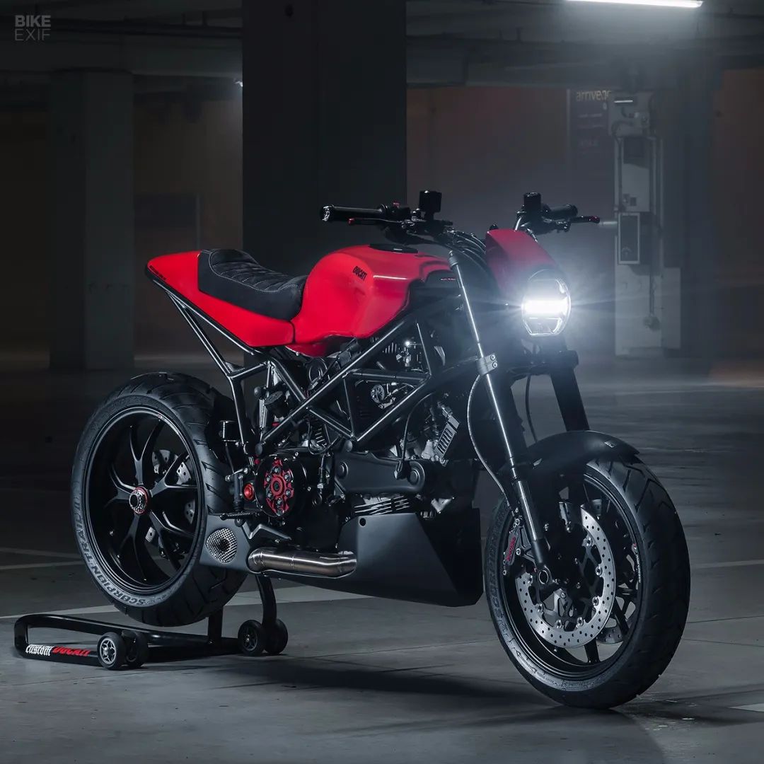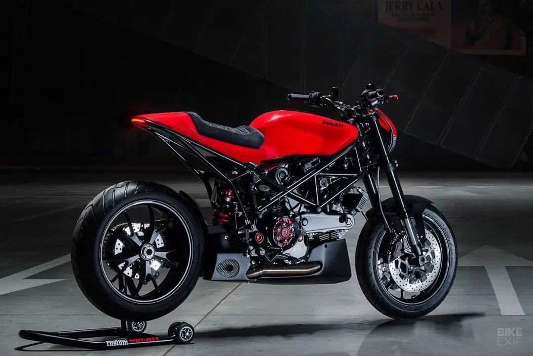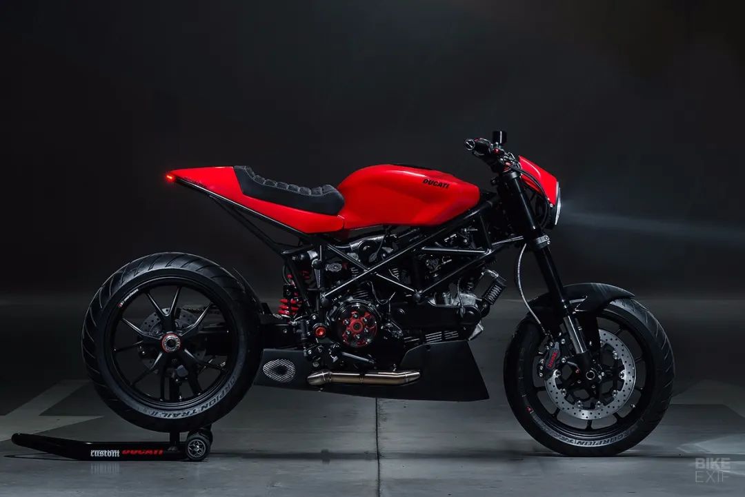 他們采用了2003年的Ducati Multistrada 1000 DS為原型車,這也是最早期的Multistrada車款。為了盡量保持這款車的原汁原味,保持了這款車標(biāo)志性的單搖臂設(shè)計(jì),減震以及制動(dòng)系統(tǒng)均沒有改動(dòng),但在副車架部分進(jìn)行了重新設(shè)計(jì),使得整個(gè)尾部線條和改裝的杜卡迪999油箱非常搭配,甚至有些Monster的感覺。