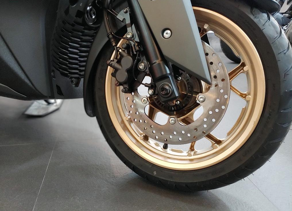 前懸架是非常常見的正立式避震,后懸掛是雙筒型避震,擁有預(yù)載可調(diào)的功能,配合全新高剛性車架、重心平衡適中。輪胎規(guī)格為前15英寸后14英寸的配置,對于操控有一定程度的提升。