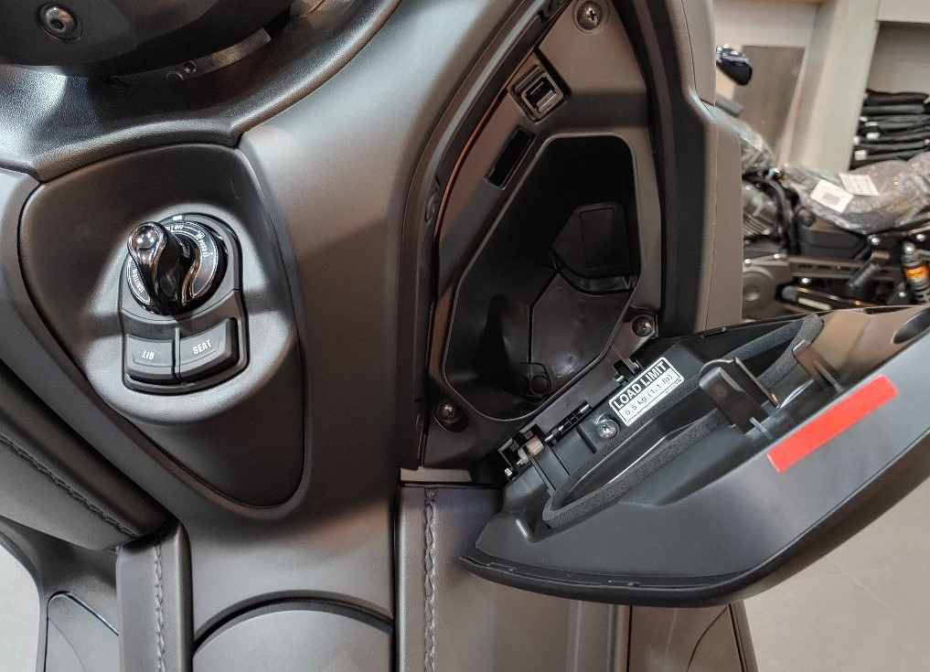 雅馬哈X-MAX300左右兩邊的手套箱儲物空間并不太大,放個小水杯、手機(jī)、錢包之類的零碎物品,左側(cè)手套箱有內(nèi)置的12V充電接口。