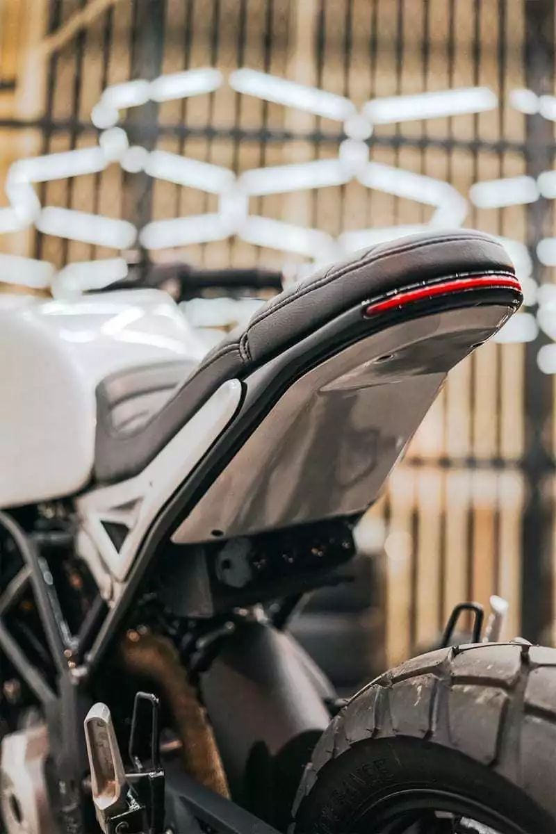 Scrambler的幾大外觀要素,不外乎是短薄的前土除、短俏的尾部、上繞的排氣管或是圓燈配上柵欄格網(wǎng)等,種種都與擁有外殼包覆且線條復(fù)雜的現(xiàn)代街車(chē)G310R大相逕庭,他們只得把車(chē)上所有的車(chē)殼全部卸下,通過(guò)切除副車(chē)架重新焊接以半圓形收尾,并融入燈條式整合尾燈,使搭配短薄椅墊的尾部更加精簡(jiǎn)。