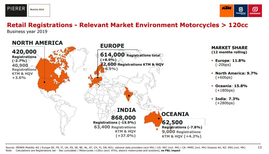在銷量增長上,2019年P(guān)IERER Mobility集團(tuán)銷量增長7%, 銷售額同比增長4%,達(dá)15.201億歐元 。 KTM對(duì)于PIERER Mobility集團(tuán)的業(yè)績增加功不可沒,KTM市場份額的增加主要來自亞太地區(qū),2019年印度市場增加了35%的銷量,通過收購澳大利亞公司進(jìn)一步攻占澳大利亞以及新西蘭的市場份額。同時(shí)在歐洲以及北美地區(qū)等傳統(tǒng)市場,KTM也保持了穩(wěn)定的增長。