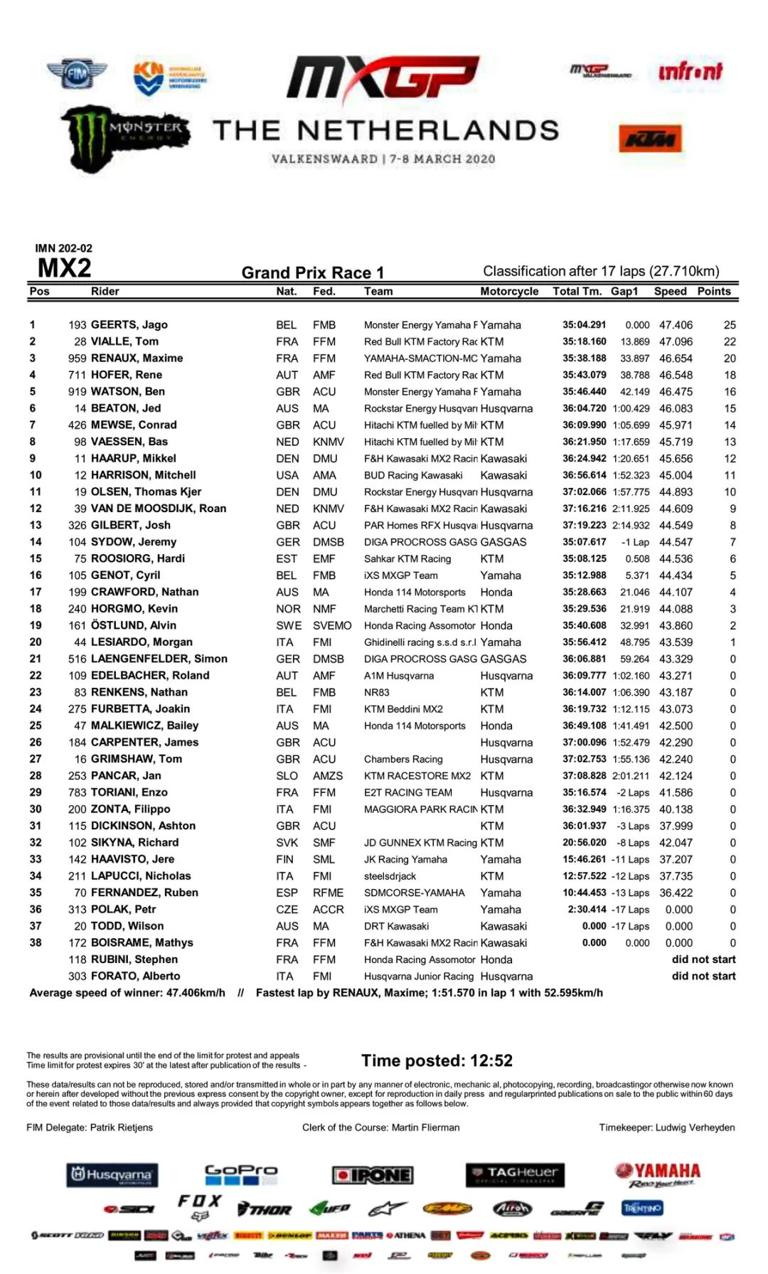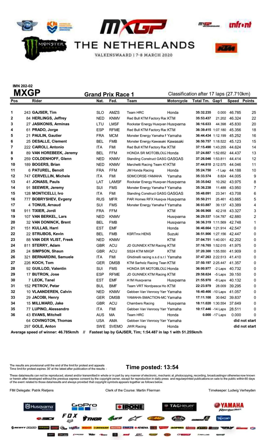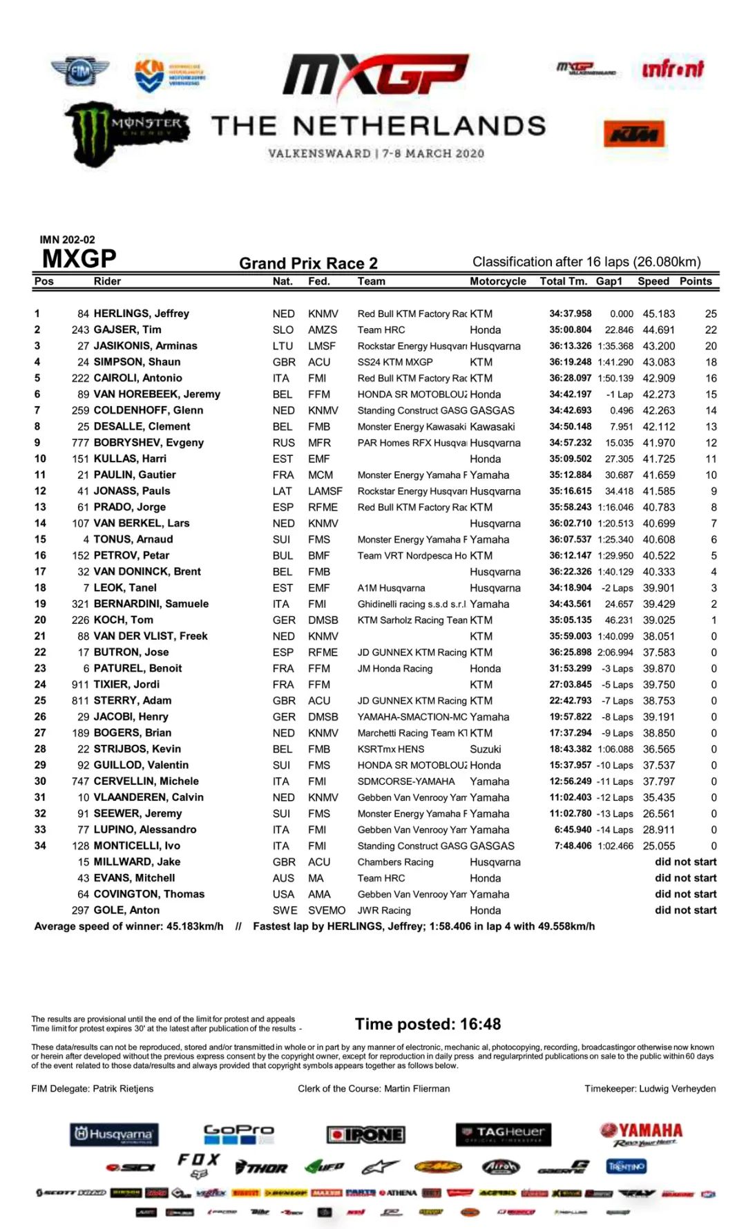 KTM 工廠車隊、駕駛 84 號車的賀靈斯(Jeffrey Herlings),胡斯瓦那工廠車隊、駕駛 27 號車的立陶宛車手賈西科尼斯(Arminas Jasikonis),分別獲得了第二、第三。