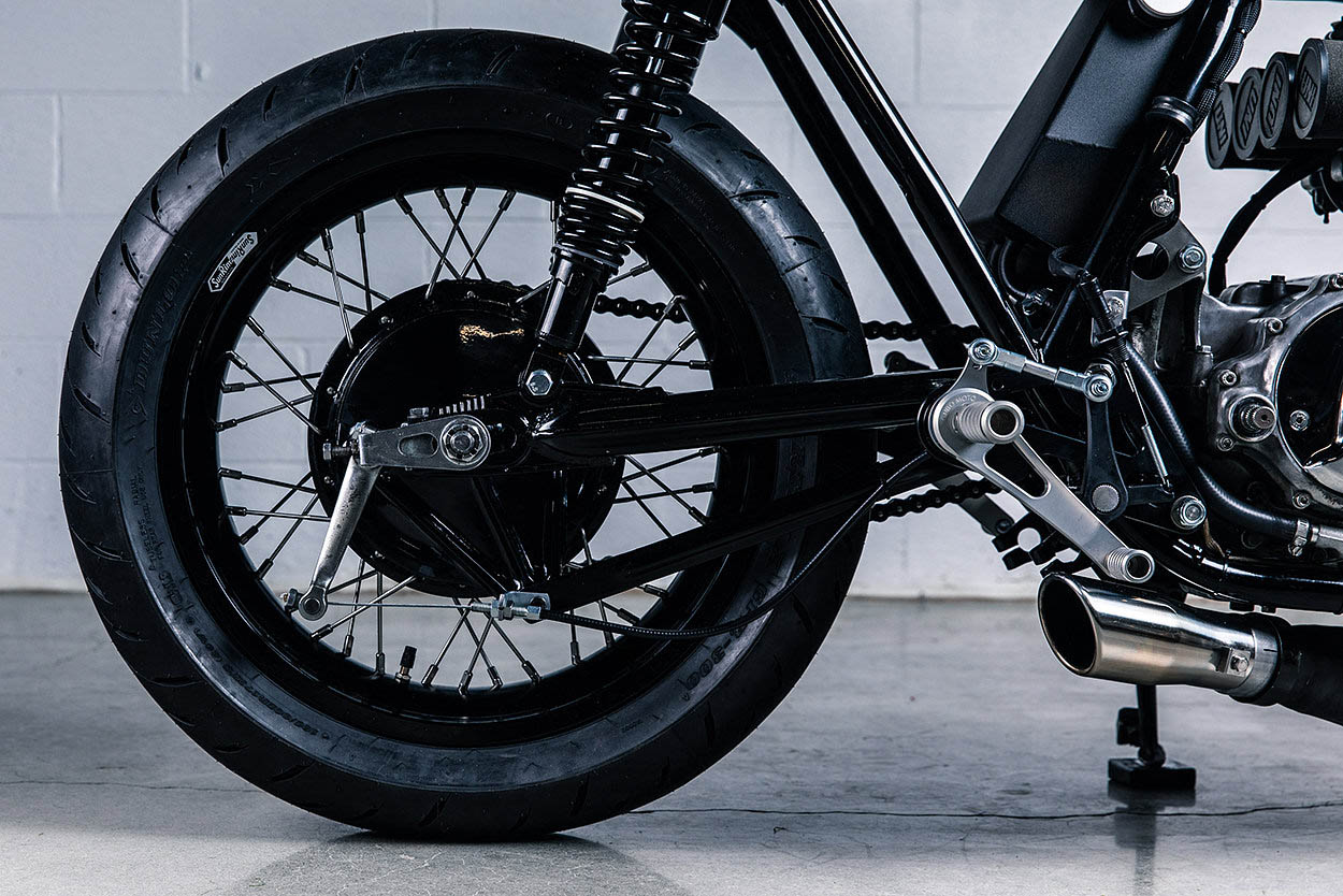 也采用了GSX-的前剎車,并對OEM本田設(shè)置進行了重大升級。后剎采用鼓制動,他解釋說:“普通的后剎車連桿的問題是腳踏板會隨著擺臂移動,這會導(dǎo)致制動壓力不均衡,具體取決于道路的輪廓。因此,我換了一條離合器電纜,然后將其安裝在拉鼓上,而不是牢固的連桿上。”