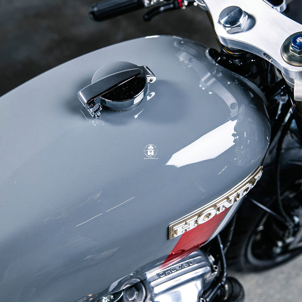 最終保留了原廠的CB750油箱,使其與Tuffside定制的尾翼匹配,并配有對比色縫制的鉆石圖案。車架被裁切以配合外觀。此外他還安裝了一組可調(diào)式卡鉗,加上Motodemic的7英寸大燈,使本田的產(chǎn)品線條更加均勻。