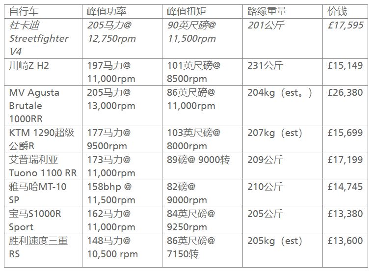 街車是增長最快的摩托車類別之一,其排量從125cc到1000cc以上都有很多選擇。MV Agusta的新Brutale 1000 RR是唯一在功率方面能與Streetfighter V4匹敵的車型,而其競爭車型只能在扭矩方面擊敗杜卡迪,但是Streetfighter在功率,重量比方面名列前茅。